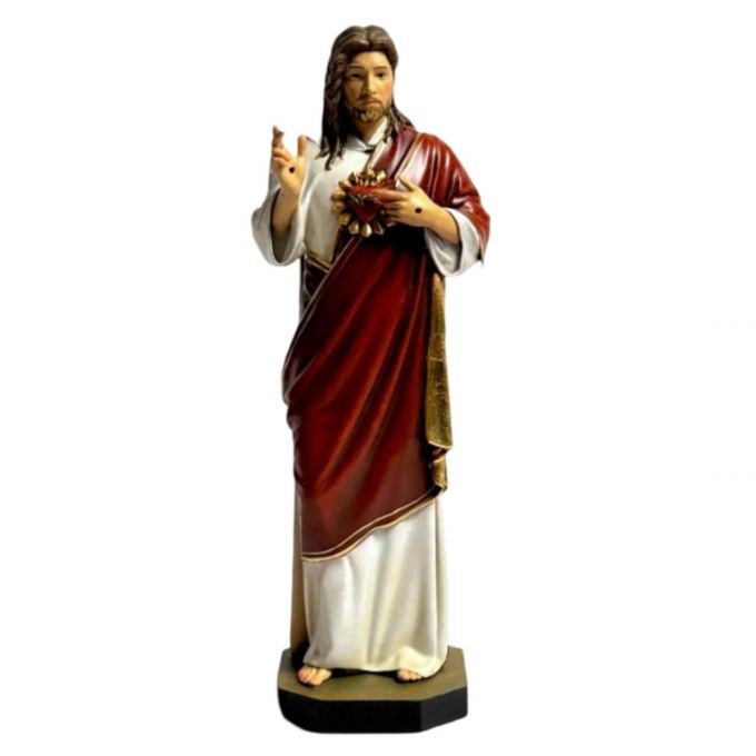 This religious statue depicts Christ with the iconic Sacred Heart, radiating divine love and mercy. Painted in rich, traditional oil colors, the figurine depicts Jesus in flowing white and dark red robes with gold accents, standing in a gentle gesture of blessing.