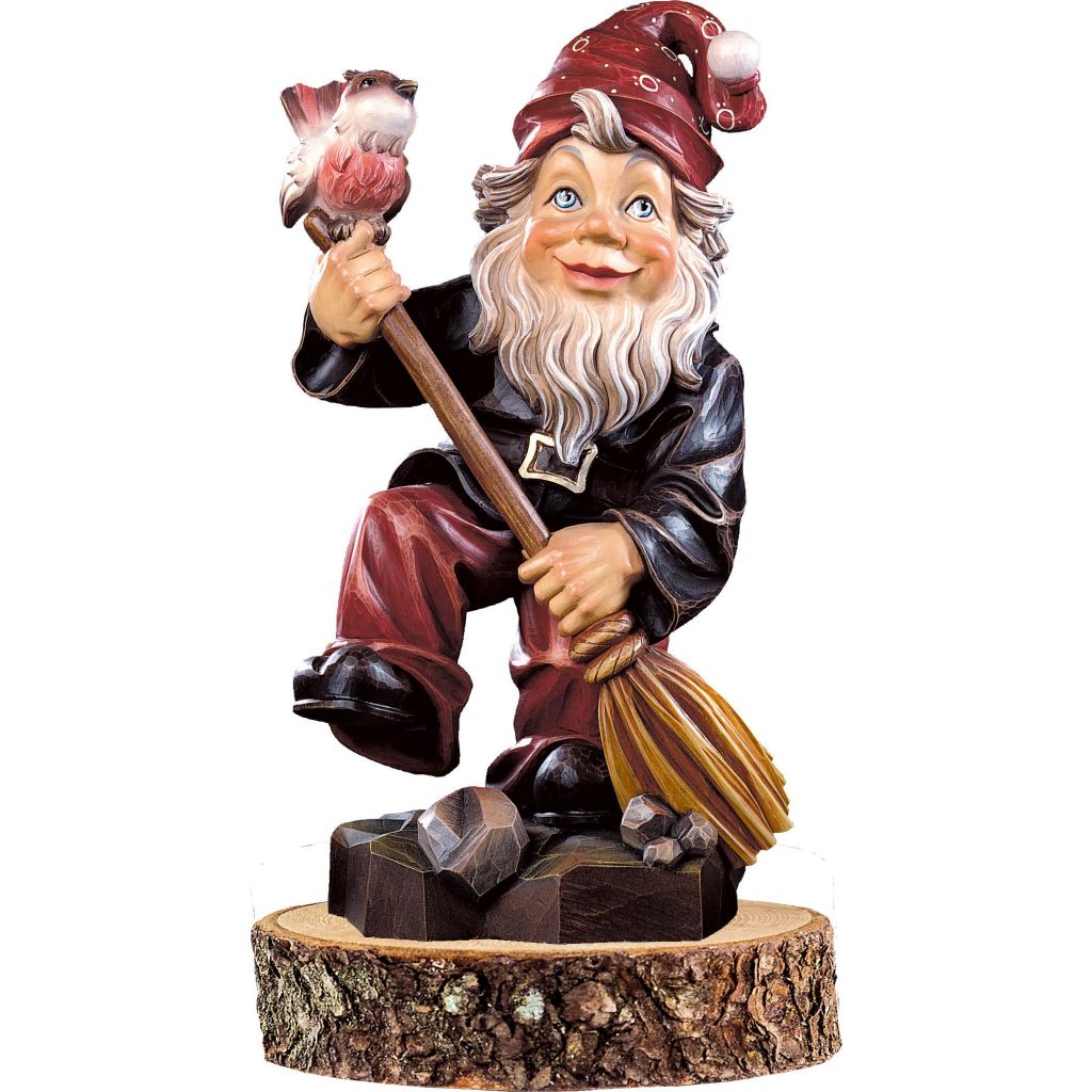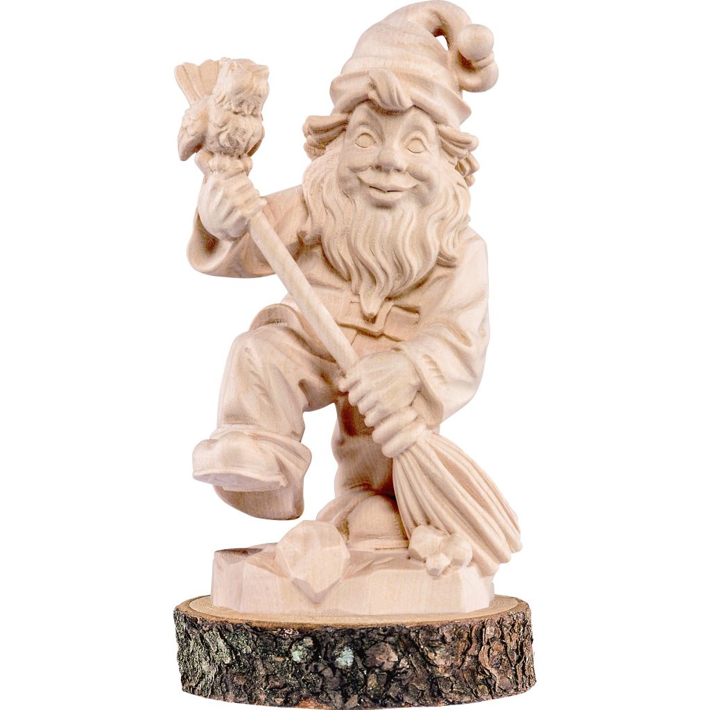 Gnome with a broom on wooden pedestal
