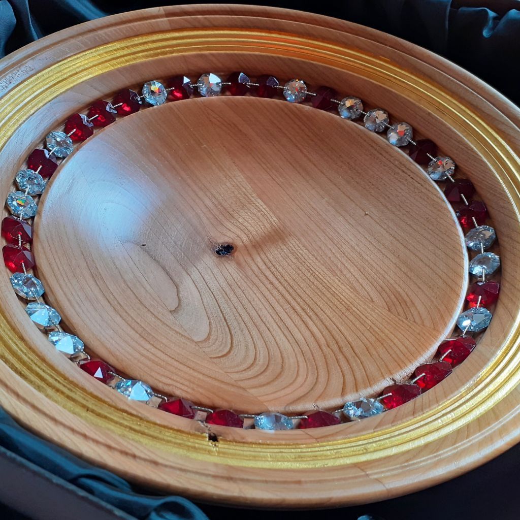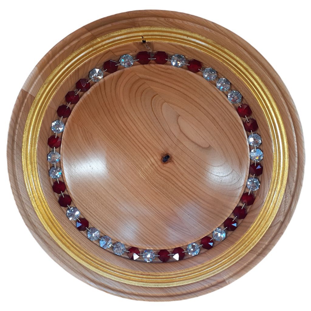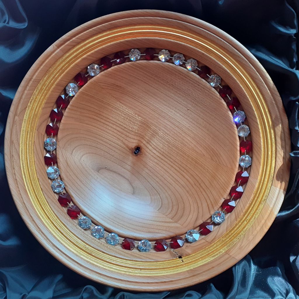 The wooden bowl is made of high-quality cherry wood, gilded with gold leaf and topped with red-white crystal. A beautiful wooden bowl complemented by sparkling cut crystals brings a feeling of luxury. It is suitable as a decoration or you can use it to serve delicious food. All precisely processed in specific artistic work procedures with fine detail and smooth surface.