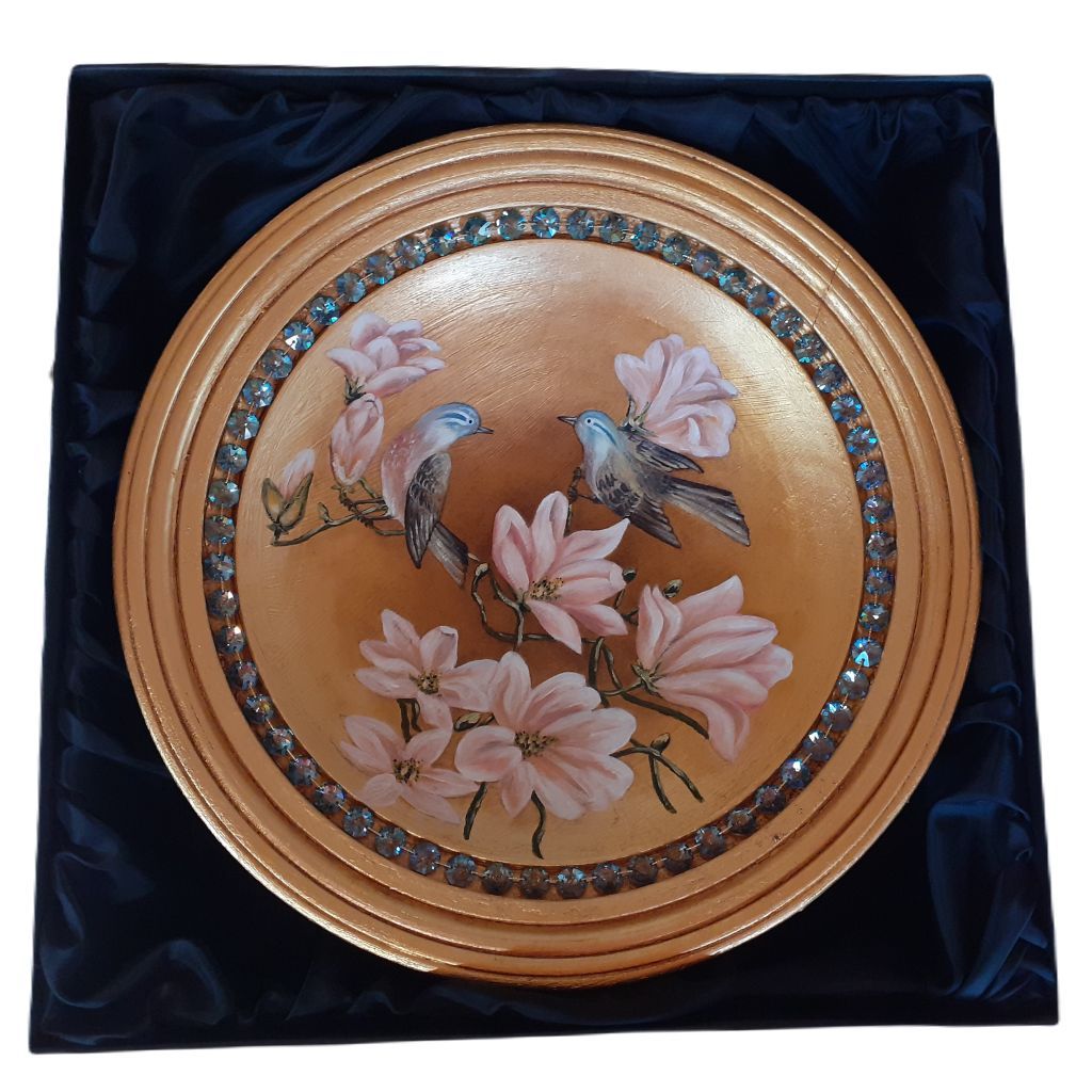 The wooden bowl is made of high-quality maple wood, gilded with gold leaf, painted with soft oil colors and topped with a crystal. A beautiful wooden bowl complemented by sparkling cut crystals brings a feeling of luxury. It is suitable as a decoration or you can use it to serve delicious food. All precisely processed in specific artistic work procedures with fine detail and smooth surface.