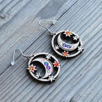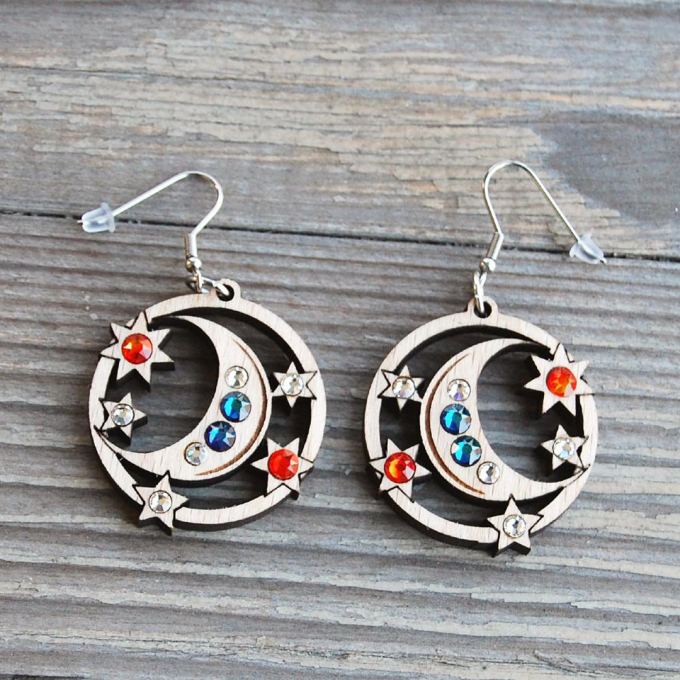Handmade Wooden Earrings Moon and Stars with crystal. Beautifully handcrafted to the last detail these stunning earrings make the perfect unique gift.