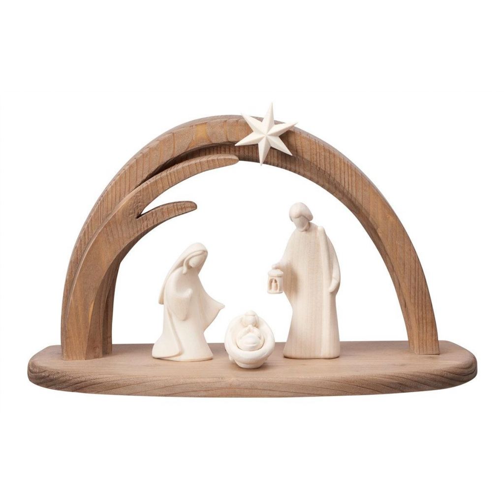 LE Betlehem Leonardo s domcom a figúrkami navrhnuté umelecké dielo spája tradíciu s estetickou vynaliezavosťou a predstavuje obraz obľúbeného vianočného príbehu. Stajňa, v ktorej sú umiestnené symbolické figúrky Narodenia Pána, predstavuje jedinečný kruhový oblúk, ktorý je dôkazom harmonického spojenia jednoduchosti a elegancie. Umelecké usporiadanie hranatých, špicatých tvarov narúša kontinuitu tohto oblúka a vnáša do inak pokojnej kompozície pútavú vizuálnu dynamiku a vlieva pocit podmanivého napätia. Na vrchole oblúka, v definujúcej centrálnej polohe, je umiestnená drevená hviezda. Tento jemne spracovaný detail slúži ako symbolický maják, ktorý odráža Betlehemskú hviezdu, ktorá viedla mágov do miesta narodenia Ježiša. Jeho umiestnenie dodáva nádych duchovnej rezonancie a historickej autentickosti a evokuje nebeský zázrak, ktorý je ústredným prvkom pôvodného príbehu. Celý domec je starostlivo zhotovený na pevnom drevenom podstavci, čo posilňuje rustikálnu autentickosť scény. Tento prvok nielenže zaisťuje stabilitu, ale tiež zvyšuje celkovú estetickú príťažlivosť súpravy a prepožičiava jej nadčasovú, dedičnú kvalitu. Drevený betlehem Leonardo s domcom nie je len obyčajná dekorácia, ale umelecká interpretácia hlbokého príbehu, zručne vytvoreného na počesť tradičnej podstaty Vianoc. Pozýva divákov do srdca vianočného príbehu a ponúka pohlcujúci, kontemplatívny zážitok, ktorý obohacuje sviatočné obdobie.