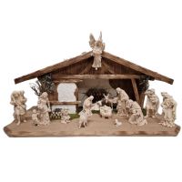 Rozmery betlehema - dĺžka 69 cm, šírka 33 cm, výška 30 cm. Veľkosť figúrok je 14 cm.