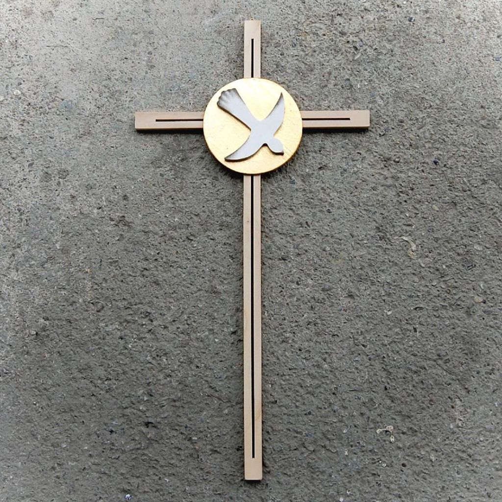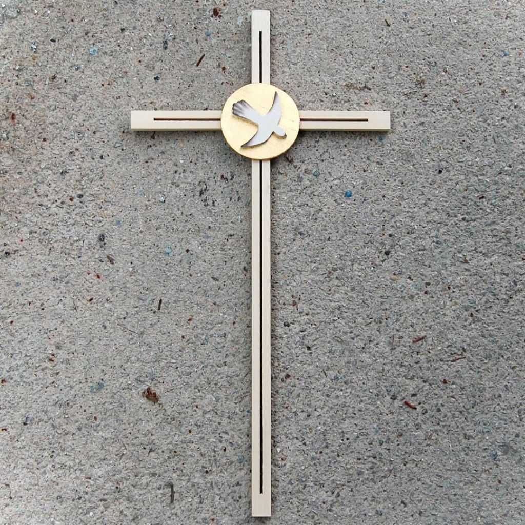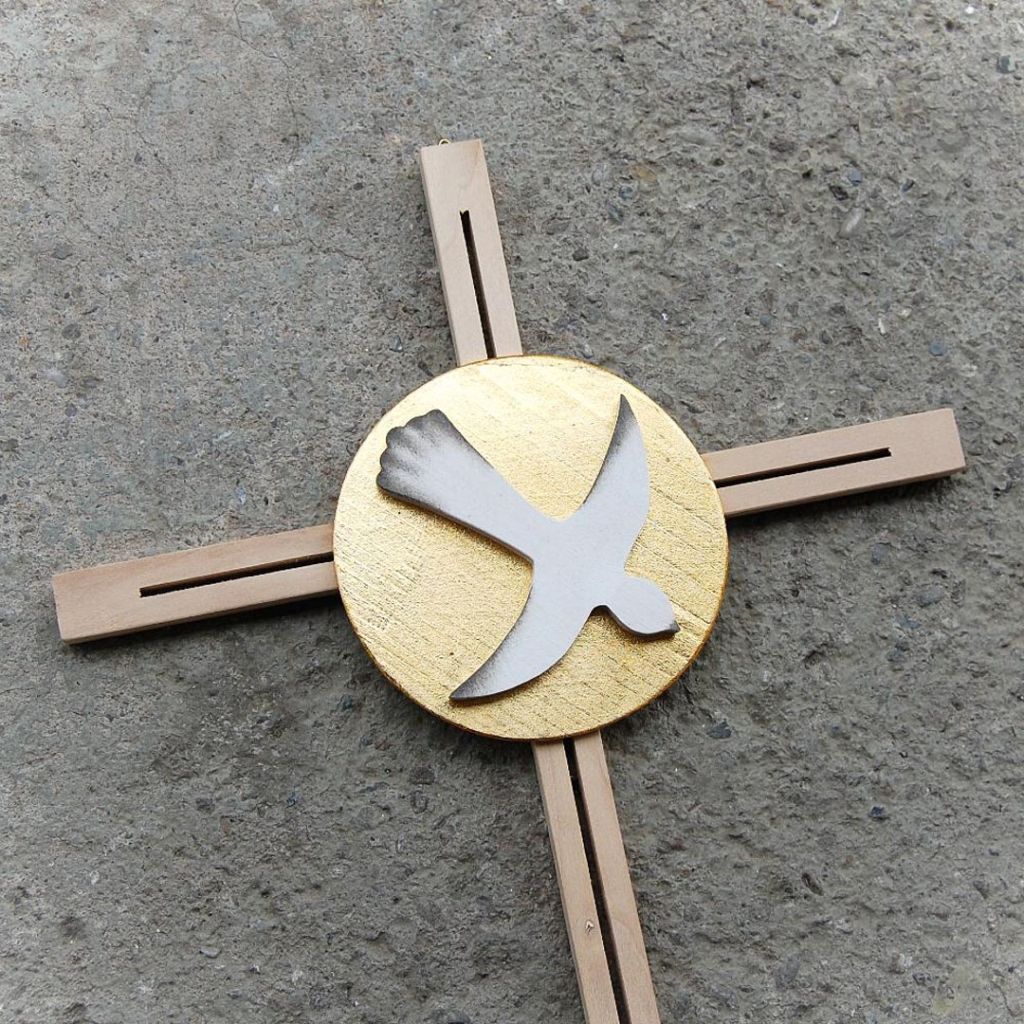 Drevený kríž s holubicou k birmovke nádherne opracovaný do posledného detailu prinesie do vášho života pokoj a mier. Vhodný aj ako darček k sviatosti birmovania. Ručne vyrobený z kvalitného javorového dreva, zdobený plátkovým zlatom a doplnený drevenou holubicou.