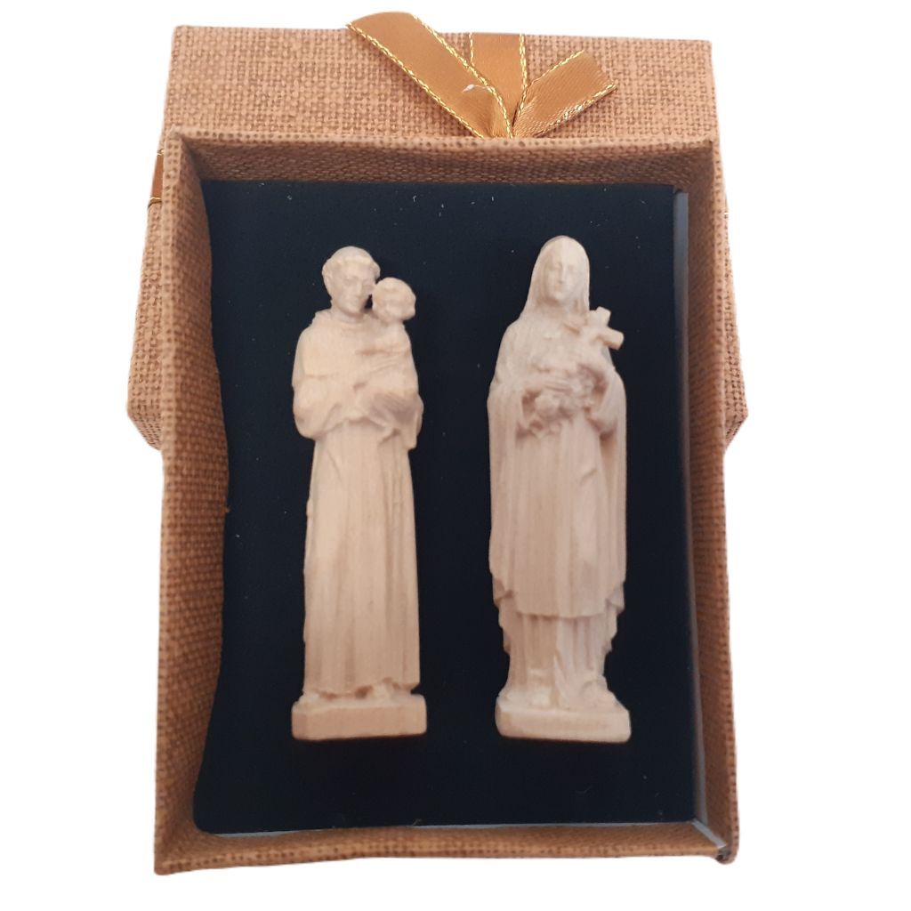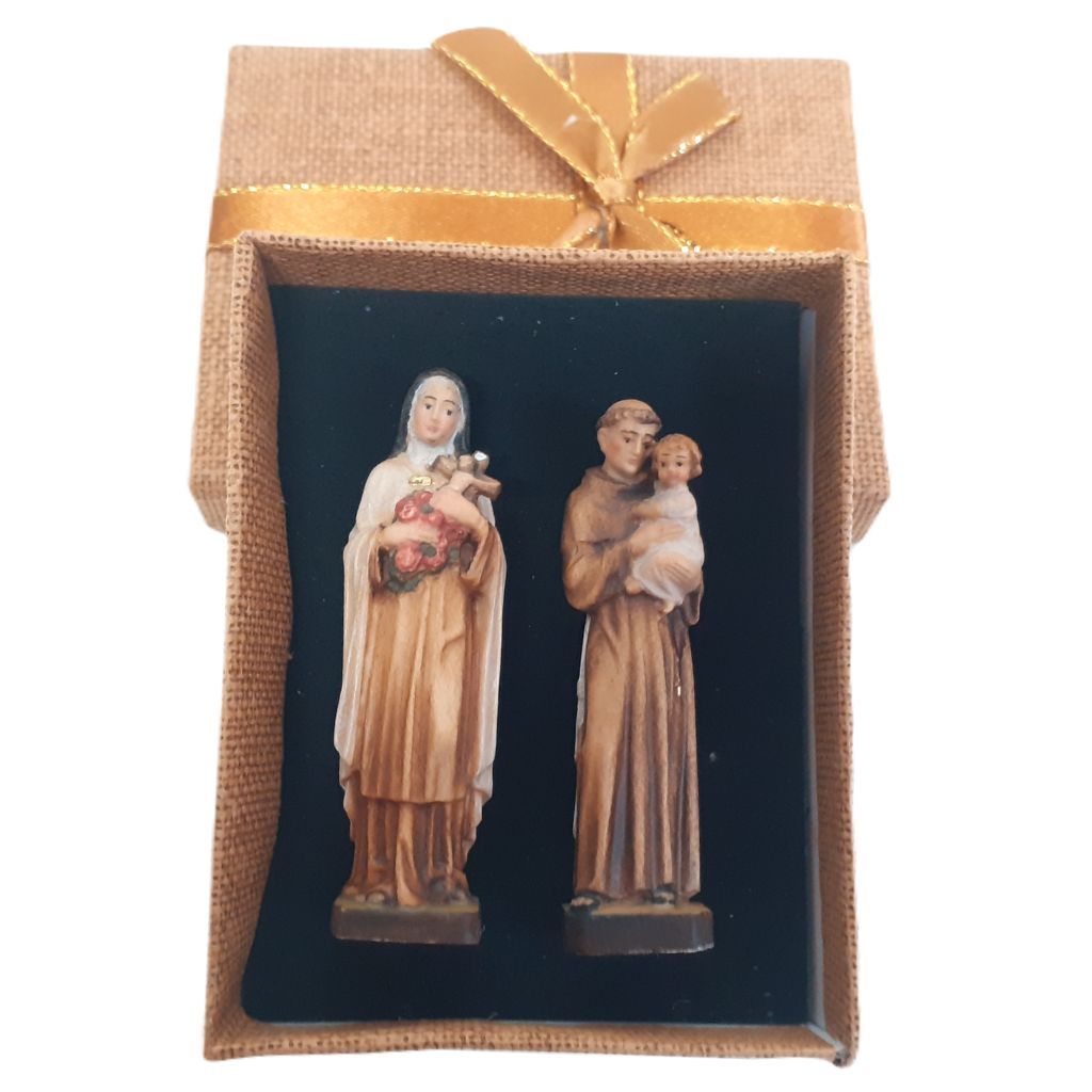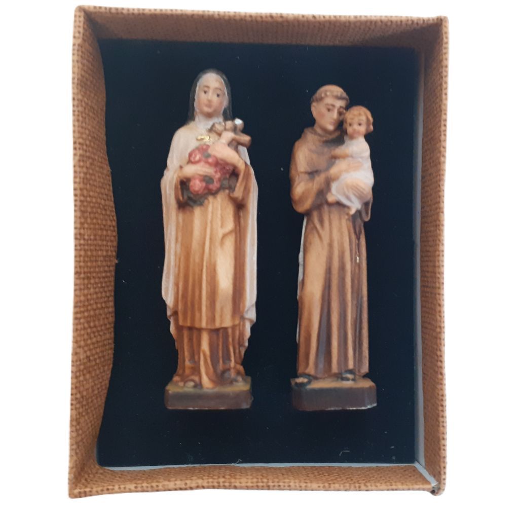 Svätý Anton je patrón, ktorého prosíme o pomoc pri hľadaní stratených vecí, je však aj patrónom chudobných.  Drevená socha svätého Antona s dieťaťom je nádherne vyrezaná z javorového dreva, ručne maľovaná jemnými olejovými farbami a zlátená tekutým zlatom. Veľkosť drevenej sochy sv. Antona je 6 cm.  Drevená socha sv. Terézie z Lisieux je nádherne vyrezaná z javorového dreva, ručne maľovaná jemnými olejovými farbami a zlátená tekutým zlatom. Veľkosť drevenej sochy sv. Terézie z Lisieux je 6 cm.
