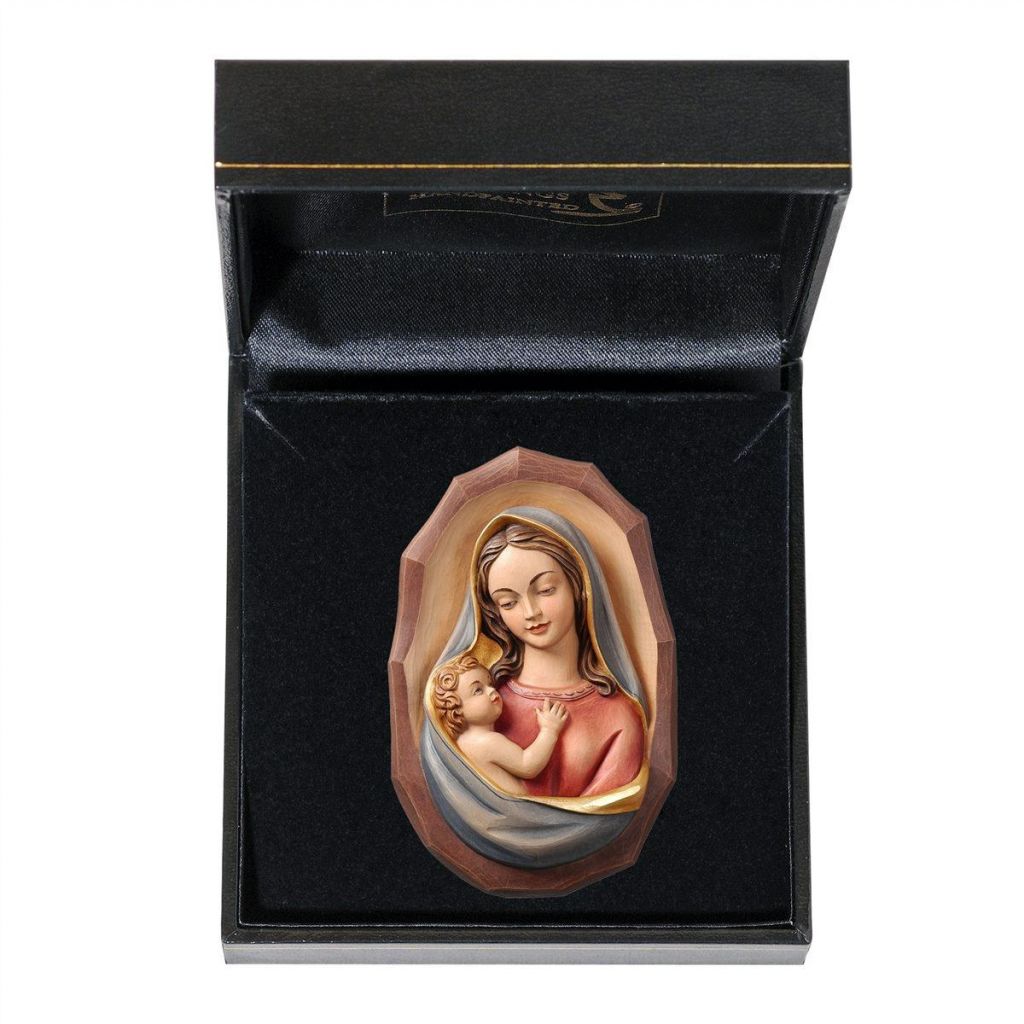 Drevená socha Panny Márie s dieťatom v darčekovom balení je nádherne maľovaná jemnými olejovými farbami a zlátená plátkovým zlatom. Dostupná vo farbe, alebo prevedení natur (prírodné drevo) v rôznych veľkostiach.