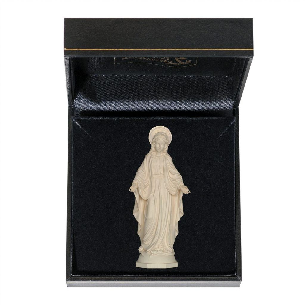 Drevená socha Panny Márie v darčekovom balení je nádherne maľovaná jemnými olejovými farbami a zlátená plátkovým zlatom. Dostupná vo farbe, alebo prevedení natur (prírodné drevo) v rôznych veľkostiach.