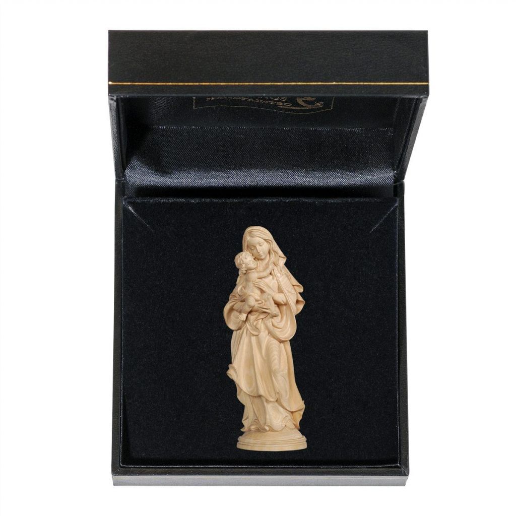 Drevená socha Panny Márie Kráľovnej v darčekovom balení je nádherne maľovaná jemnými olejovými farbami a zlátená plátkovým zlatom. Dostupná vo farbe, alebo prevedení natur (prírodné drevo) v rôznych veľkostiach.