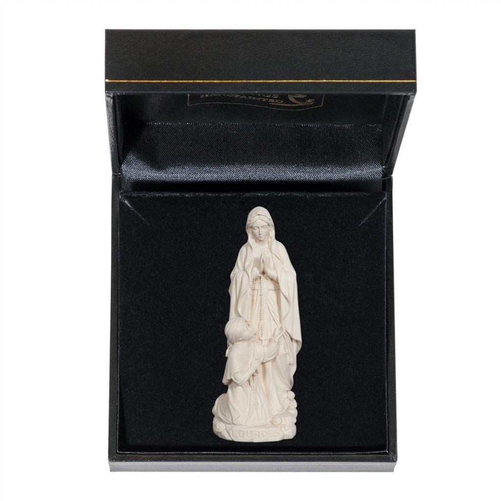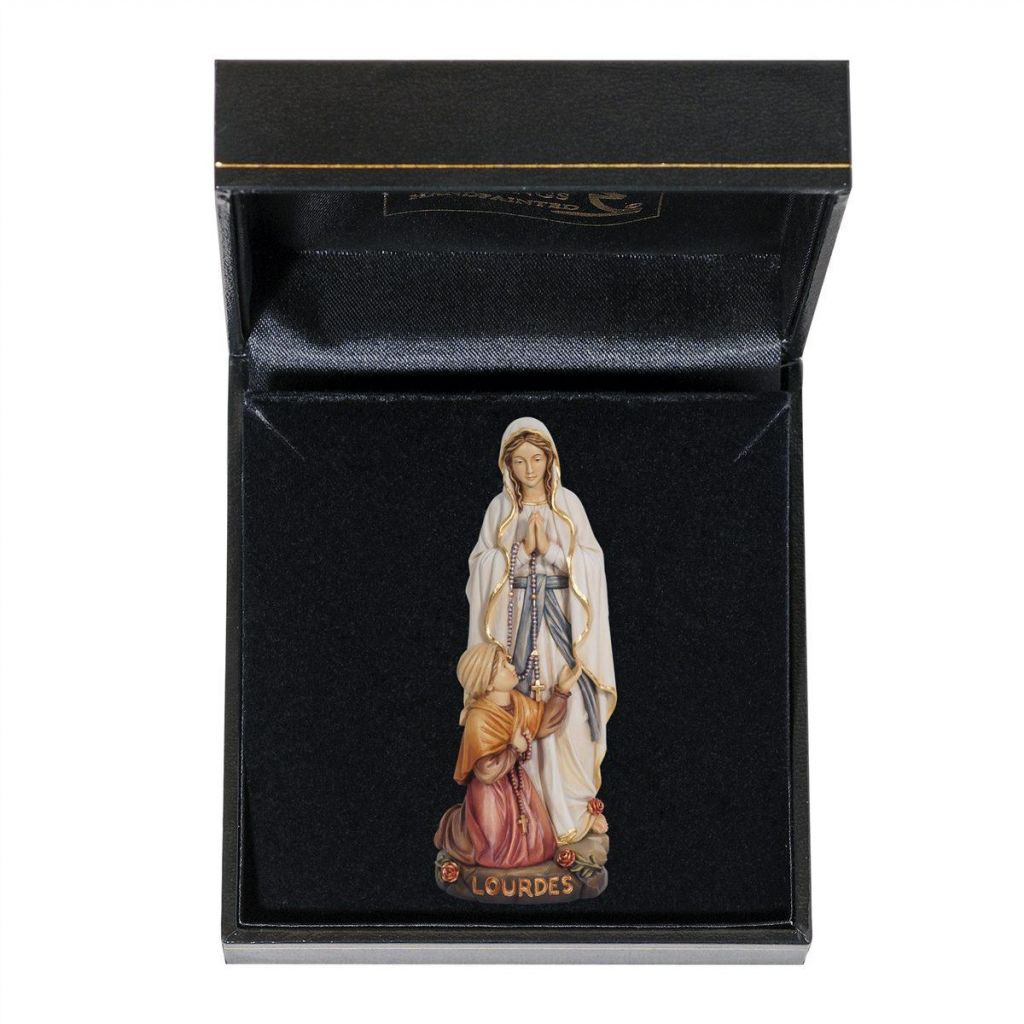 Drevená socha Panny Márie Lurdskej s Bernadetou v darčekovom balení je nádherne maľovaná jemnými olejovými farbami a zlátená plátkovým zlatom. Dostupná vo farbe, alebo prevedení natur (prírodné drevo) v rôznych veľkostiach.