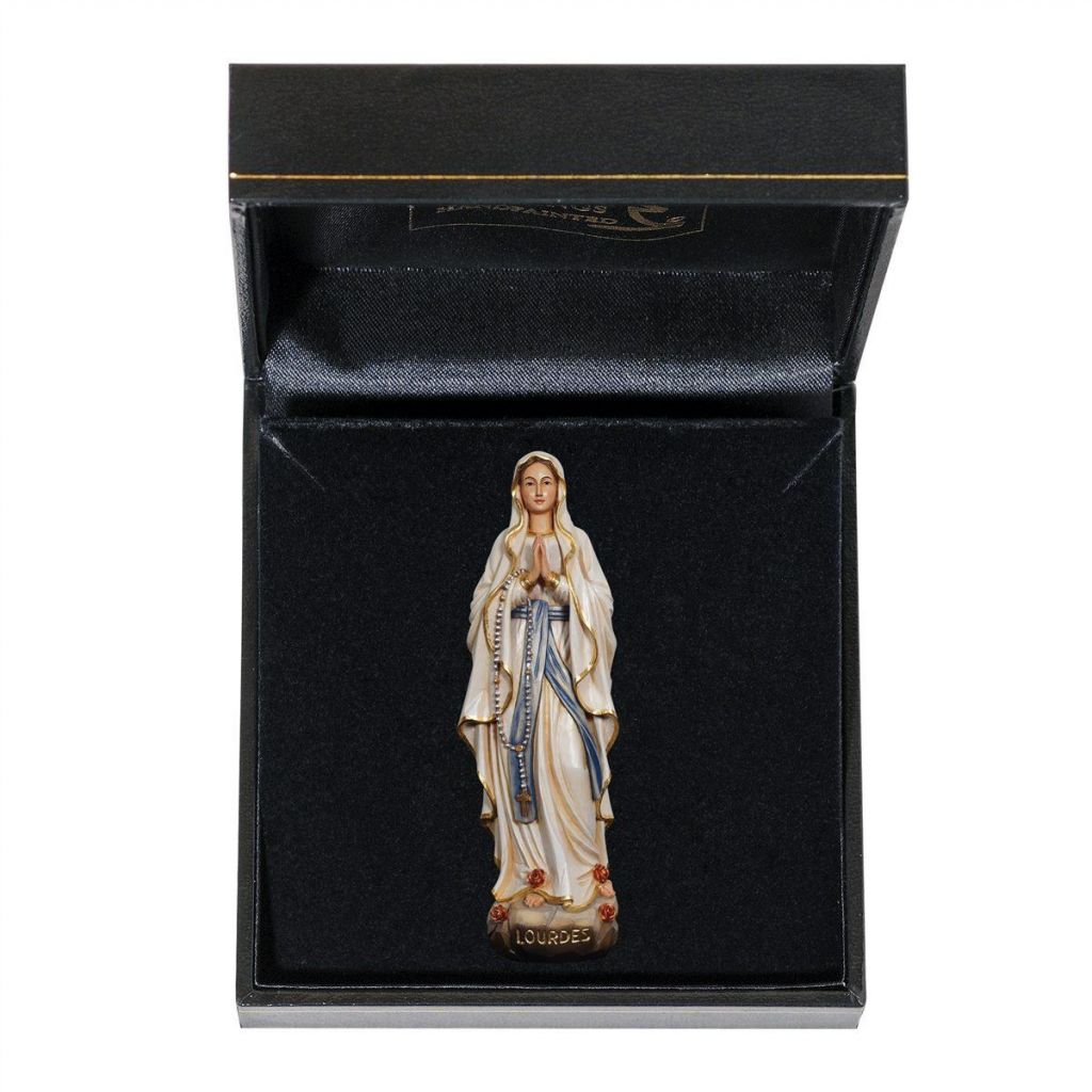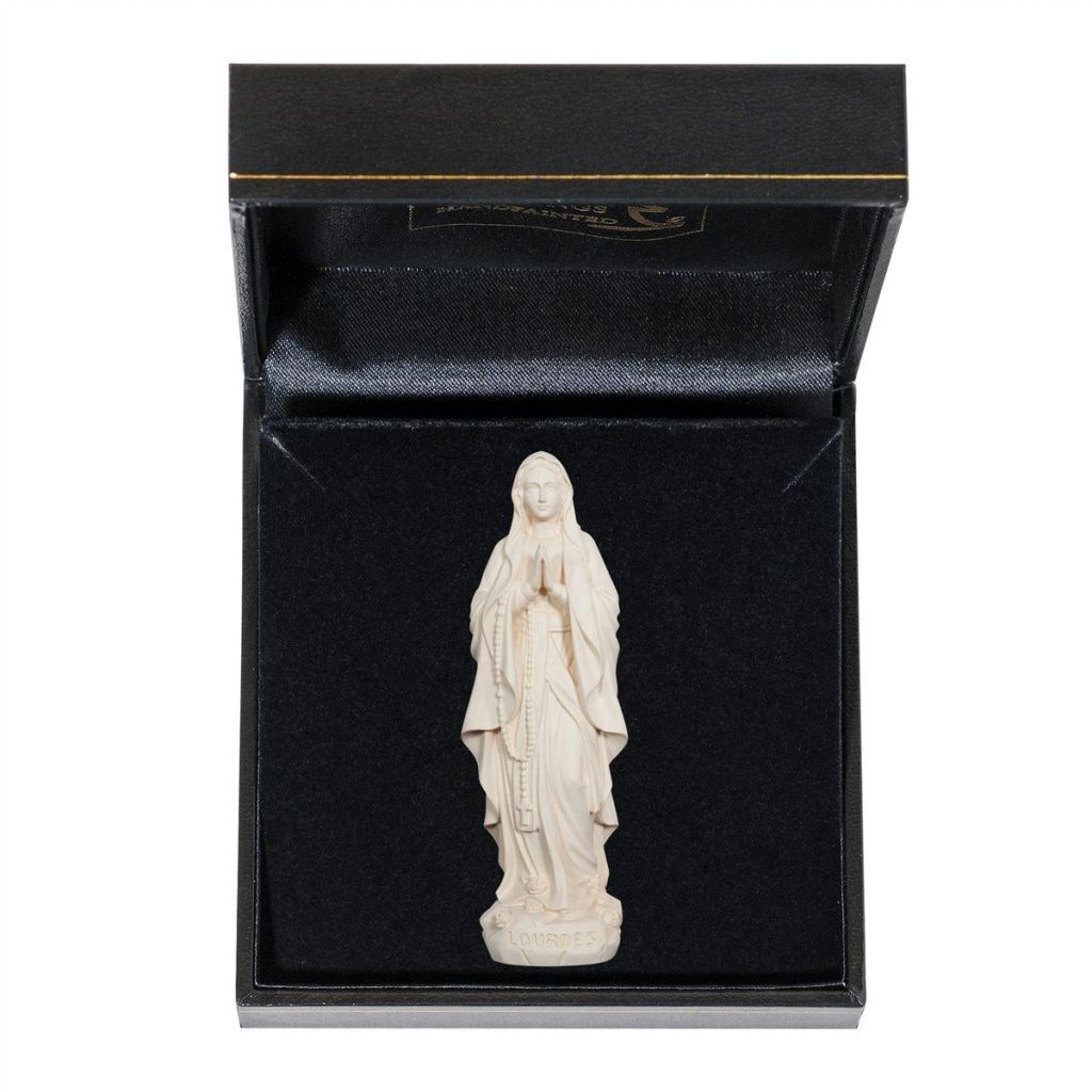 Drevená socha Panny Márie Lurdskej v darčekovom balení je nádherne maľovaná jemnými olejovými farbami a zlátená plátkovým zlatom. Dostupná vo farbe, alebo prevedení natur (prírodné drevo) v rôznych veľkostiach.