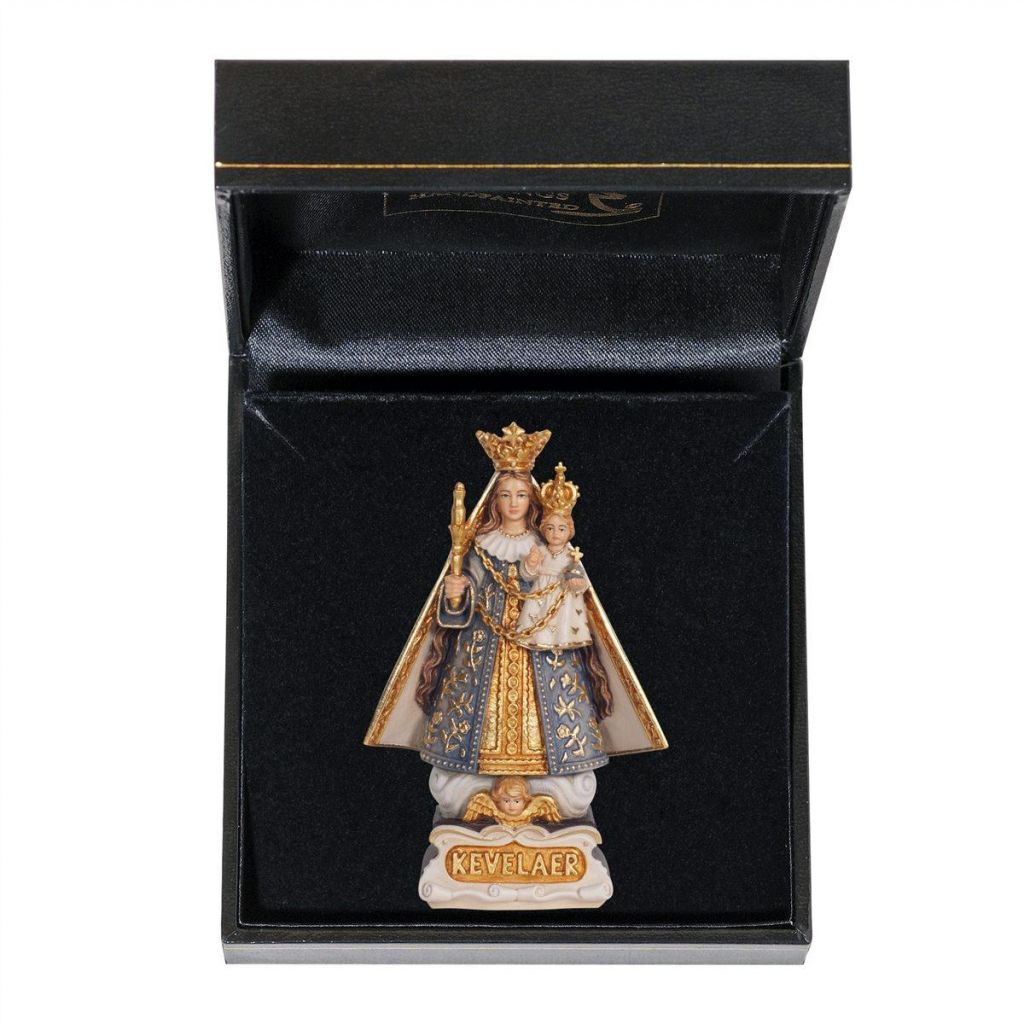 Drevená socha Panny Márie z Kevelaer v darčekovom balení je nádherne maľovaná jemnými olejovými farbami a zlátená plátkovým zlatom. Dostupná vo farbe, alebo prevedení natur (prírodné drevo) v rôznych veľkostiach.