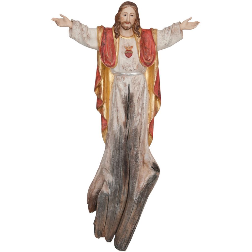 Drevená socha Najsvätejšieho srdca Ježišovho je nádherne vyrezaná z koreňového dreva, ručne maľovaná jemnými olejovými farbami a zlátená plátkovým zlatom. Dostupná vo farbe.