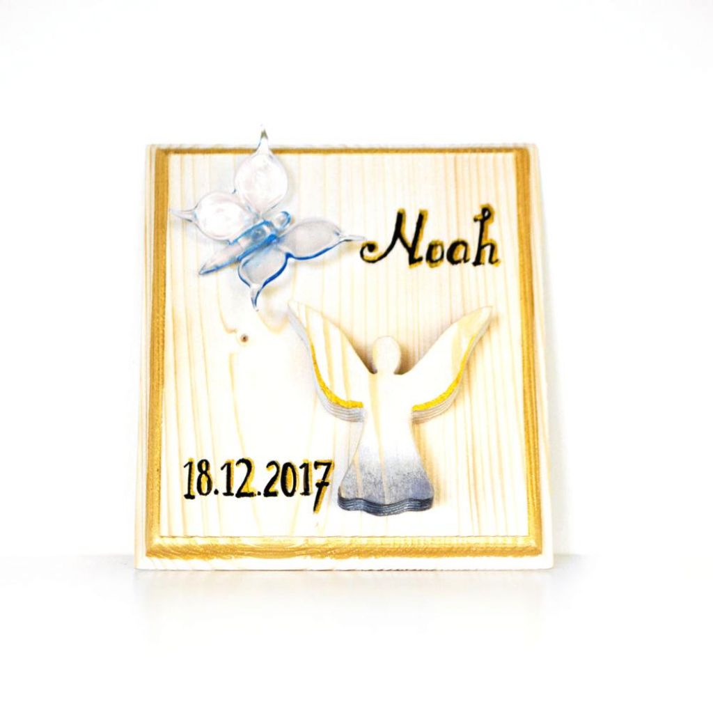 Nádherný, ručne vyrezávaný drevený obraz vhodný ako originálny darček ku krstu dieťatka. K objednávke nám, prosíme, pripíšte meno a dátum narodenia dieťatka.