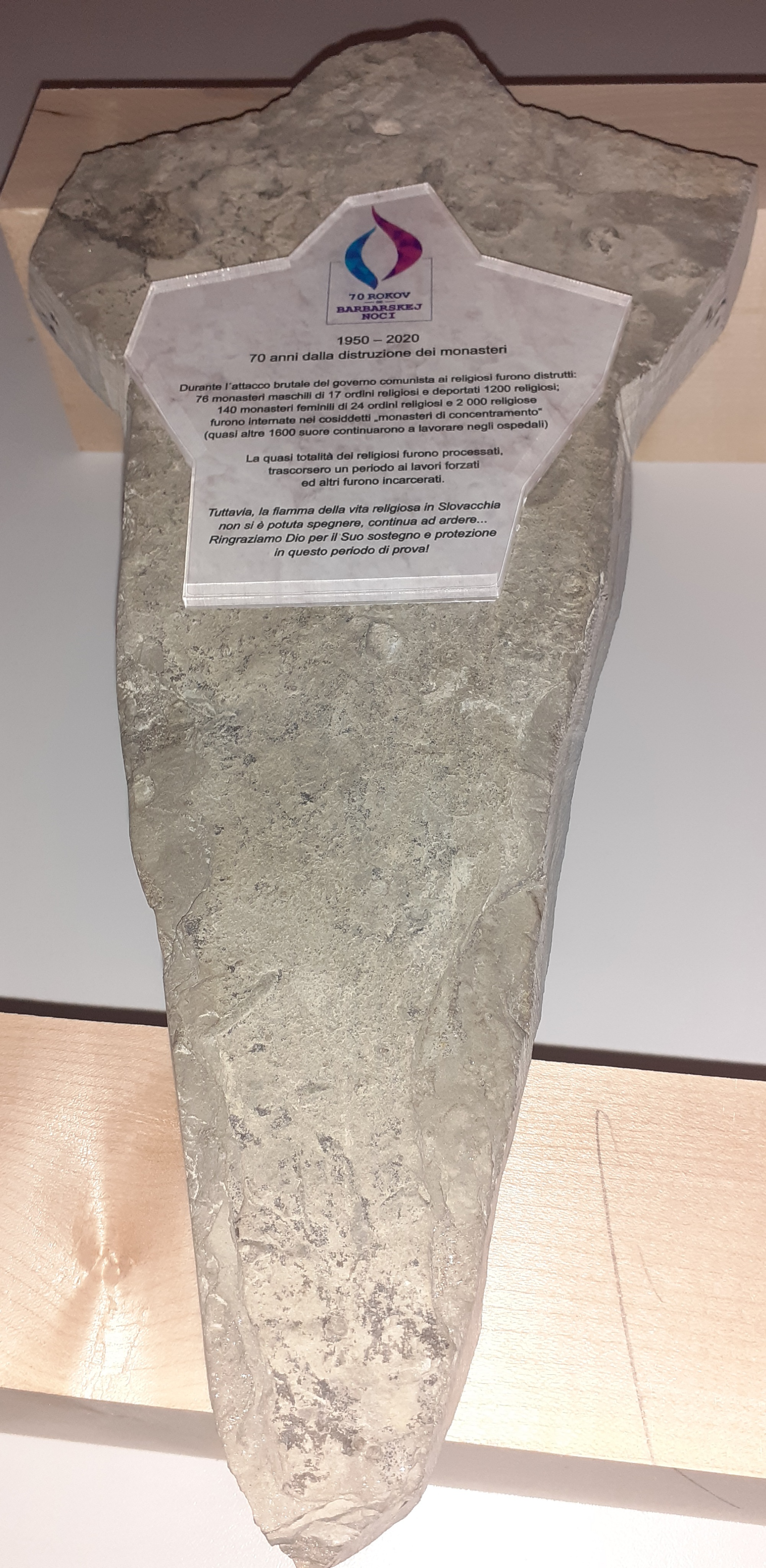 Sestra Jana Kurkinová v článku pokračuje: „Počas brutálneho útoku komunistickej vlády bolo zničených: 76 mužských kláštorov 17 reholí a odvezených bolo 1.200 rehoľníkov, a tiež 140 ženských kláštorov 24 reholí a 2.000 rehoľníčok bolo internovaných do tzv. sústreďovacích kláštorov“ (ďalších asi 1.600 sestier pokračovalo pracovať v nemocniciach). Väčšina rehoľníkov bolo súdených, strávili určitý čas na nútených prácach a ďalší boli uväznení. Plameň rehoľného života na Slovensku sa však nepodarilo uhasiť, stále horí… Ďakujeme Bohu za jeho podporu a ochranu v tomto čase skúšky!“ – to sú slová, ktoré sa nachádzajú (v taliančine) na zadnej strane kríža.“