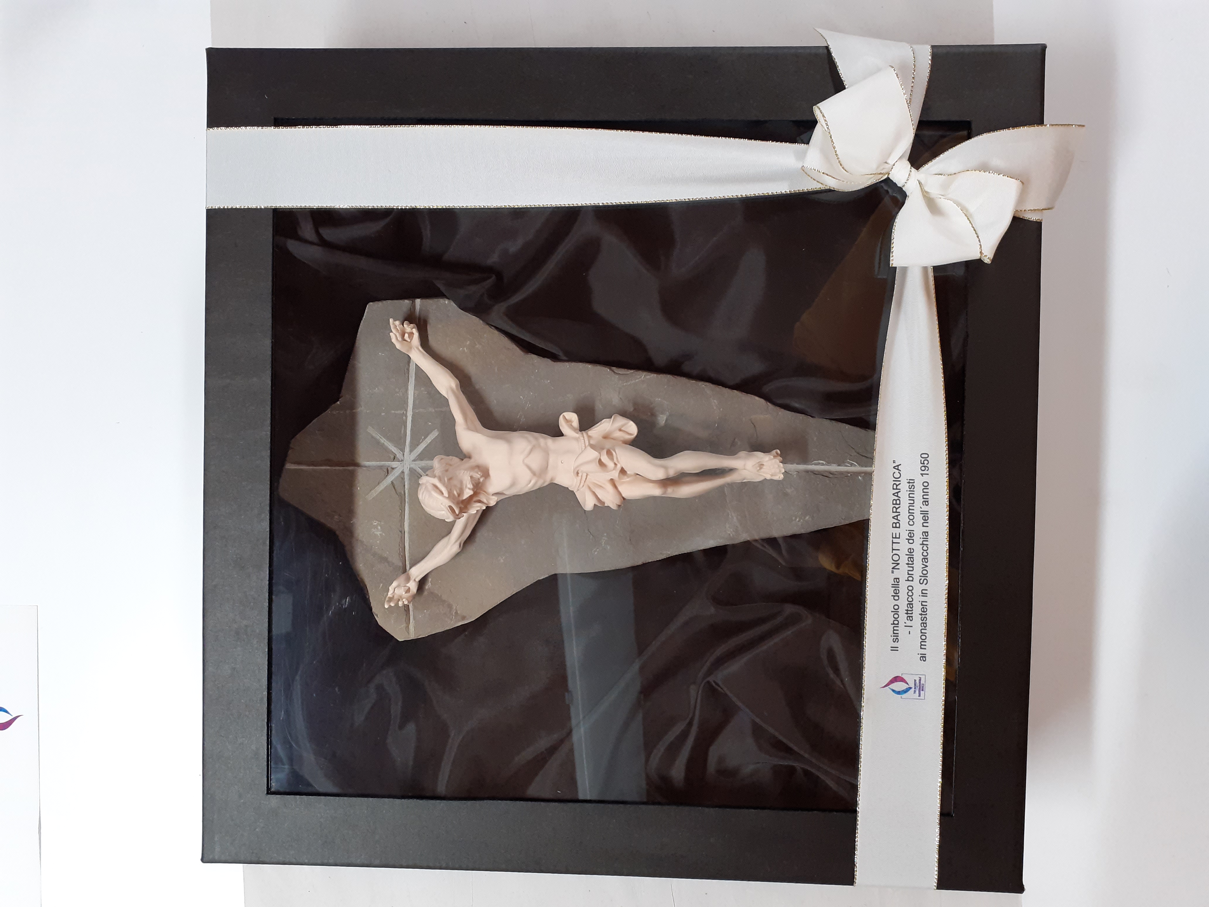 Dar tvorila kamenná platňa vo veľkosti 40 centimetrov vyjadrujúca tvrdosť zákroku voči rehoľníkom a rehoľniciam počas obdobia komunistickej totality. Na platni je barokový korpus Ukrižovaného vo veľkosti 21 centimetrov. Pohľad na trpiaceho Krista dával našim bratom a sestrám silu ísť ďalej, poskytoval istotu o božej láske a blízkosti aj v čase útlaku, prenasledovania a násilia. Je symbolom vernosti rehoľníkov aj v časoch skúšky. Prikladáme citát z článku na stránke Konferencie vyšších rehoľných predstavených na Slovensku: