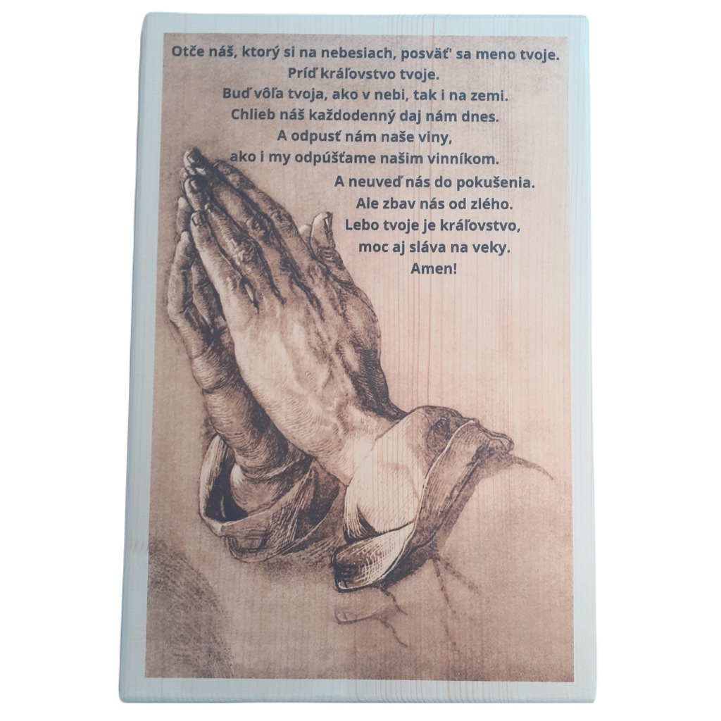 Drevený obraz s modlitbou: Otče náš, ktorý si na nebesiach, posväť' sa meno tvoje. Príď kráľovstvo tvoje. Buď vôľa tvoja, ako v nebi, tak i na zemi. Chlieb náš každodenný daj nám dnes. A odpusť nám naše viny, ako i my odpúšťame našim vinníkom.  A neuveď nás do pokušenia. Ale zbav nás od zlého. Lebo tvoje je kráľovstvo, moc aj sláva na veky. Amen!