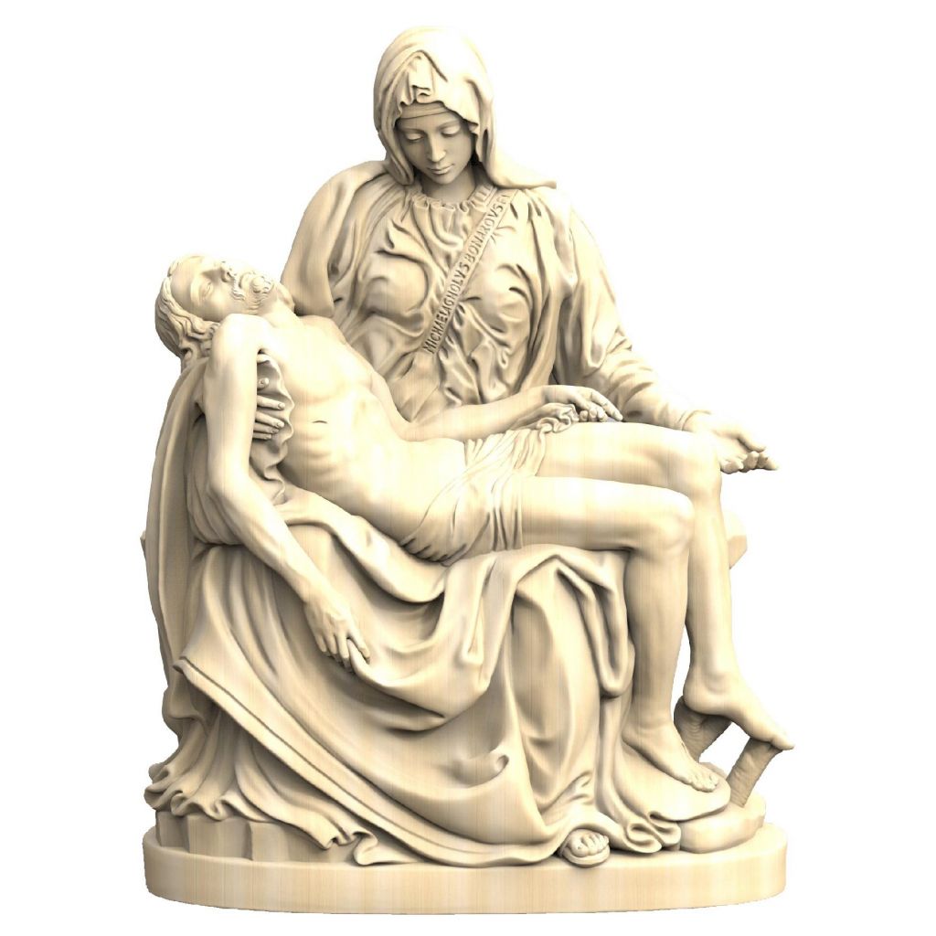 Pieta je námetom v kresťanskom umení, ktorý zobrazuje Blahoslavenú Pannu Máriu, ktorá zviera smrteľné telo Ježiša Krista po jeho zostúpení z kríža.Socha je nádherne vyrezaná z javorového dreva, ručne maľovaná jemnými olejovými farbami a zlátená plátkovým zlatom. Dostupná vo farbe, alebo prevedení natur (prírodné drevo) v rôznych veľkostiach.