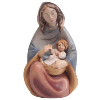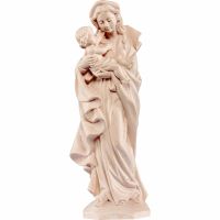 Drevená socha Panny Márie s dieťaťom je nádherne vyrezaná z javorového dreva, ručne maľovaná jemnými olejovými farbami a zlátená plátkovým zlatom. Dostupná vo farbe, alebo prevedení natur (prírodné drevo) v rôznych veľkostiach.