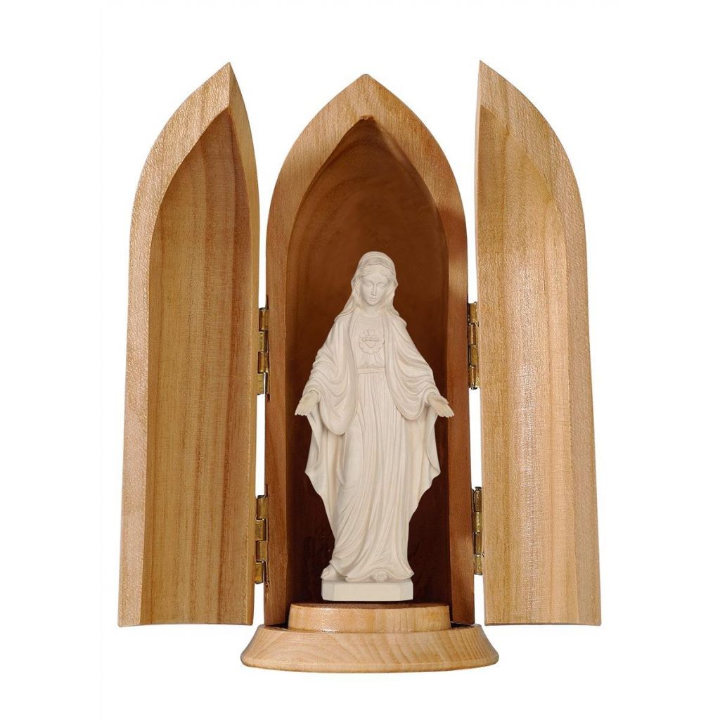 Drevená socha Najsvätejšiej Panny Márie je nádherne maľovaná jemnými olejovými farbami a zlátená plátkovým zlatom. Dostupná vo farbe, alebo prevedení natur (prírodné drevo) v rôznych veľkostiach.
