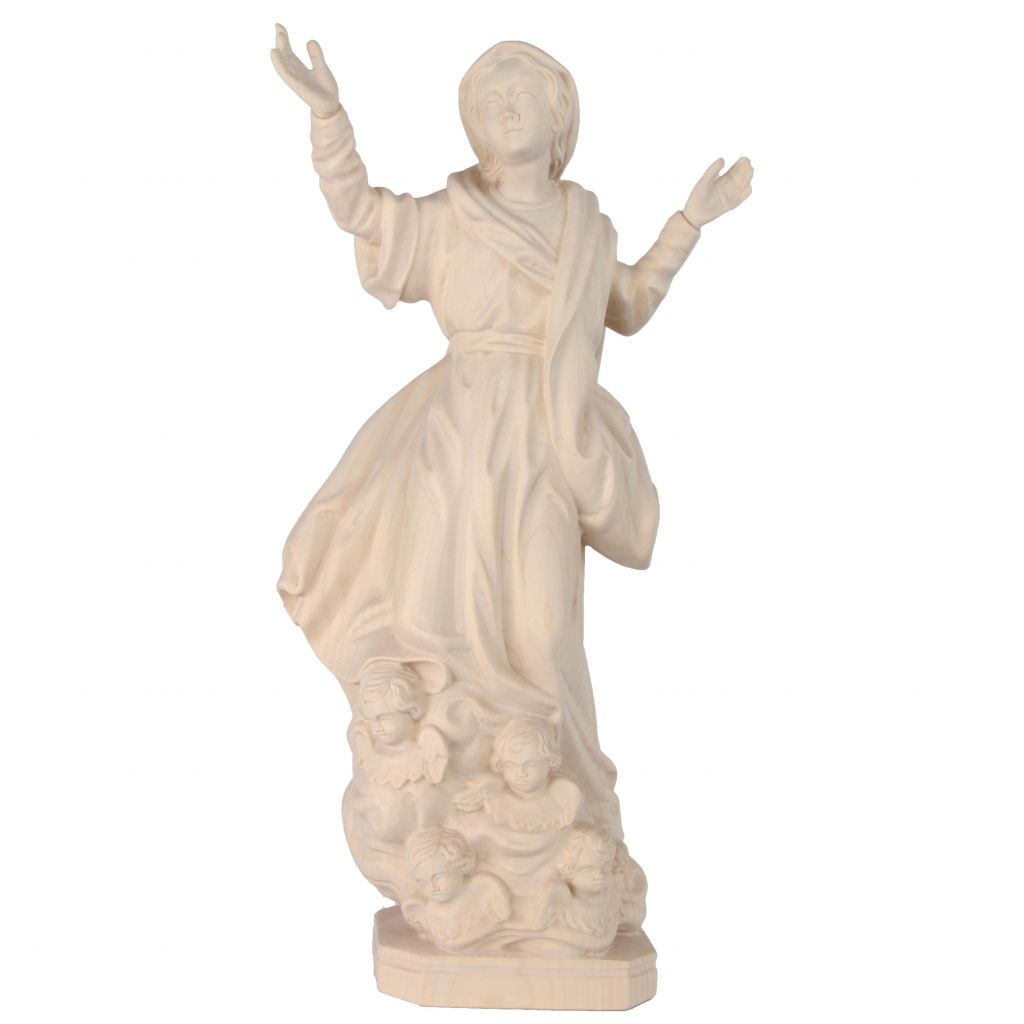Drevená socha je vyrezaná z javorového dreva, nádherne maľovaná jemnými olejovými farbami a zlátená pravým plátkovým zlatom. Dostupná vo farbe, alebo prevedení natur (prírodné drevo) v rôznych veľkostiach.