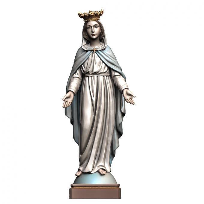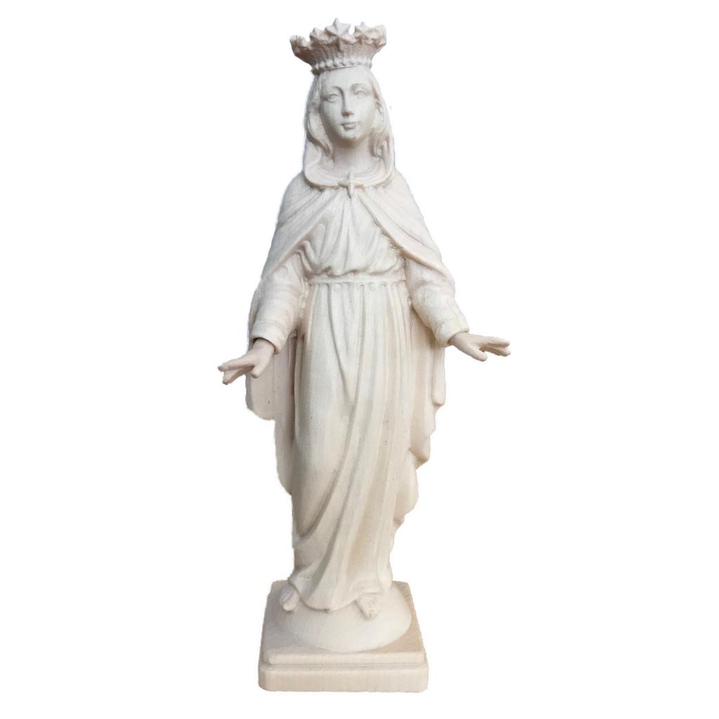 Drevená socha Nepoškvrnenej Panny Márie je nádherne vyrezaná z javorového dreva, ručne maľovaná jemnými olejovými farbami a zlátená plátkovým zlatom. Dostupná vo farbe, alebo prevedení natur (prírodné drevo) v rôznych veľkostiach.