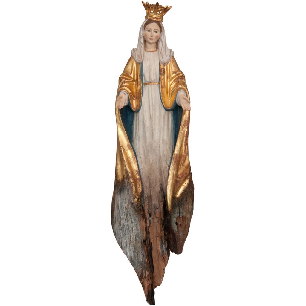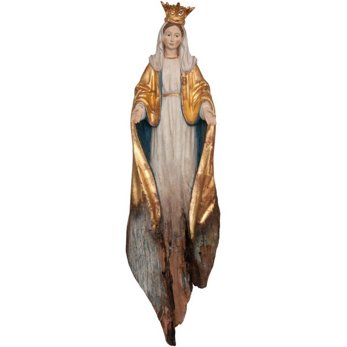 Drevená socha Nepoškvrnenej Panny Márie je nádherne vyrezaná z koreňového dreva, ručne maľovaná jemnými olejovými farbami a zlátená plátkovým zlatom. Dostupná vo farbe.