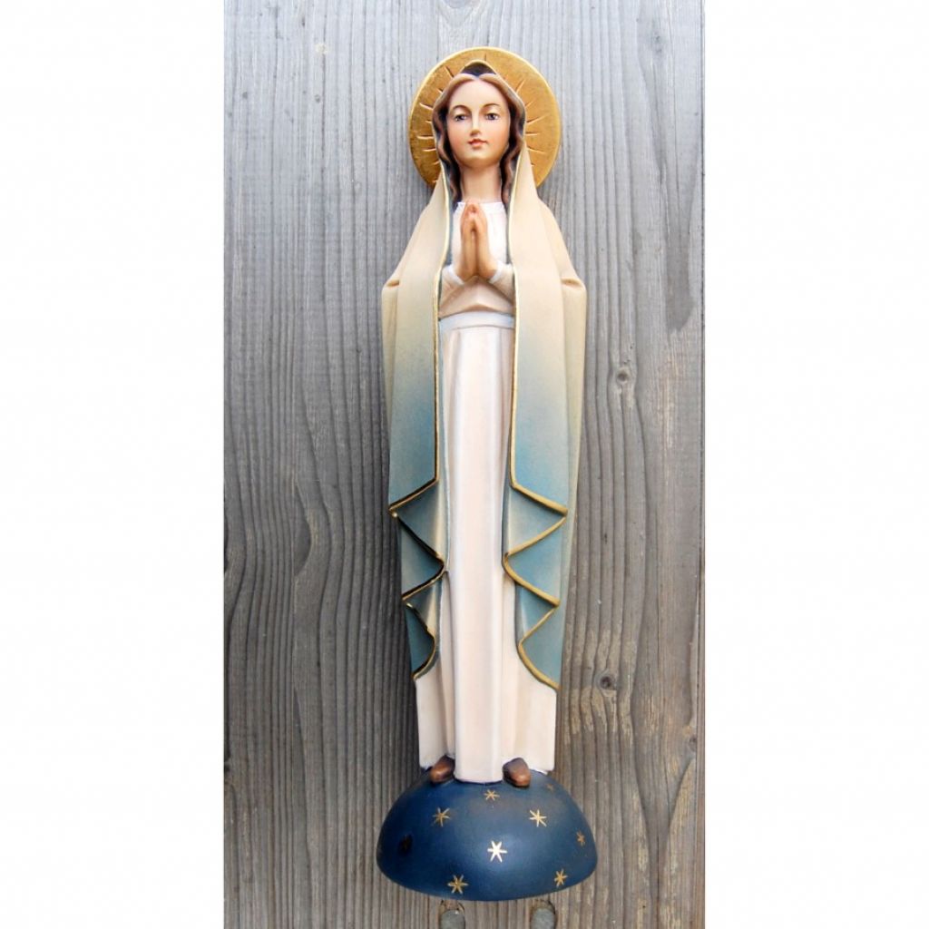 Drevená socha Panny Márie Fatimskej je nádherne vyrezaná z masívneho dreva, zlátená plátkovým zlatom a ručne maľovaná jemnými olejovými farbami. Dostupná vo farbe, alebo prevedení natur (prírodné drevo) v rôznych veľkostiach.