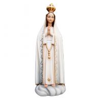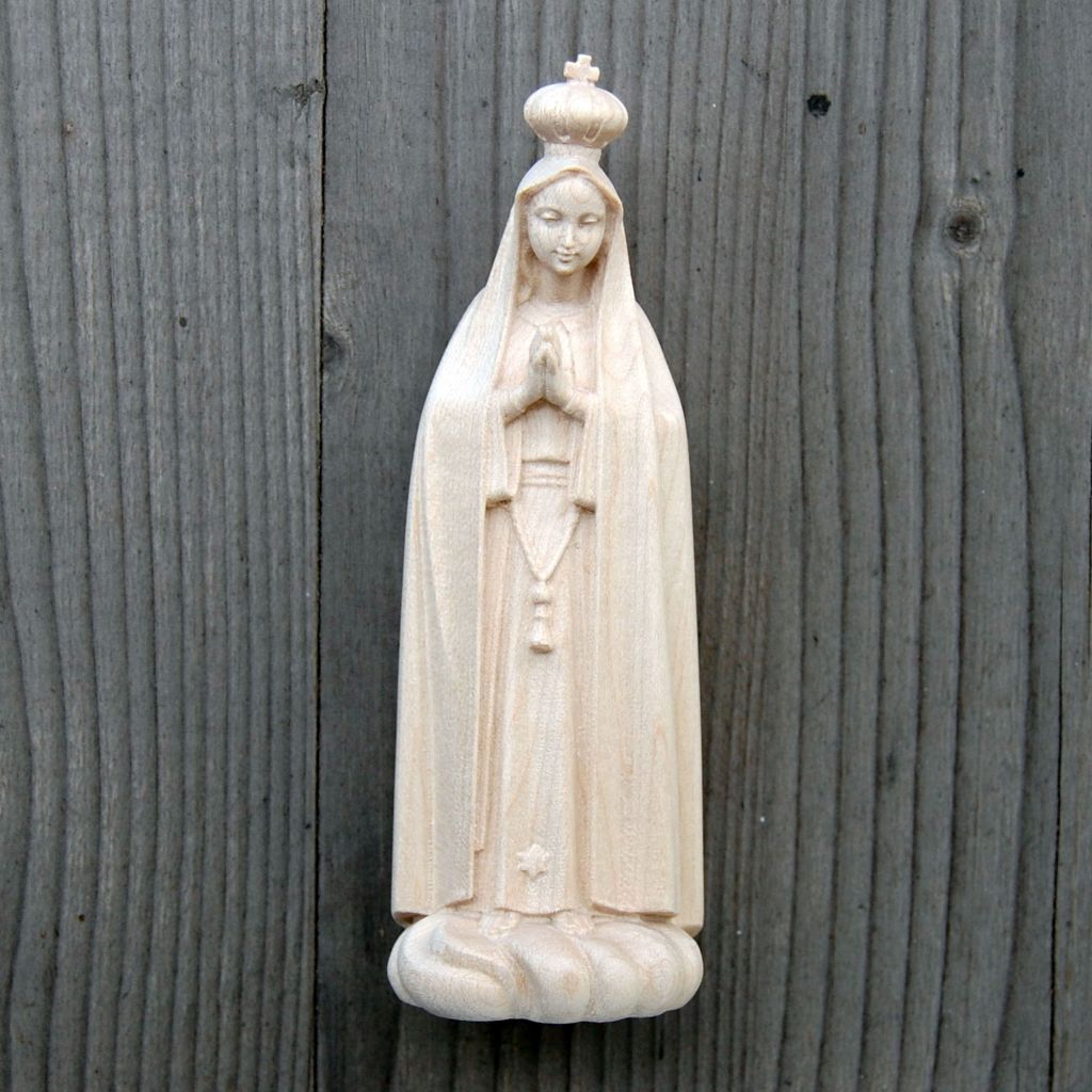 Drevená socha Panny Márie Fatimskej je nádherne vyrezané z masívneho dreva a ručne maľovaná jemnými olejovými farbami a zlátená plátkovým zlatom. Dostupná vo farbe, alebo prevedení natur (prírodné drevo) v rôznych veľkostiach.