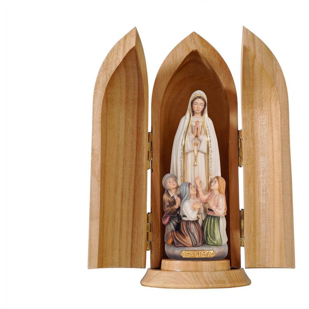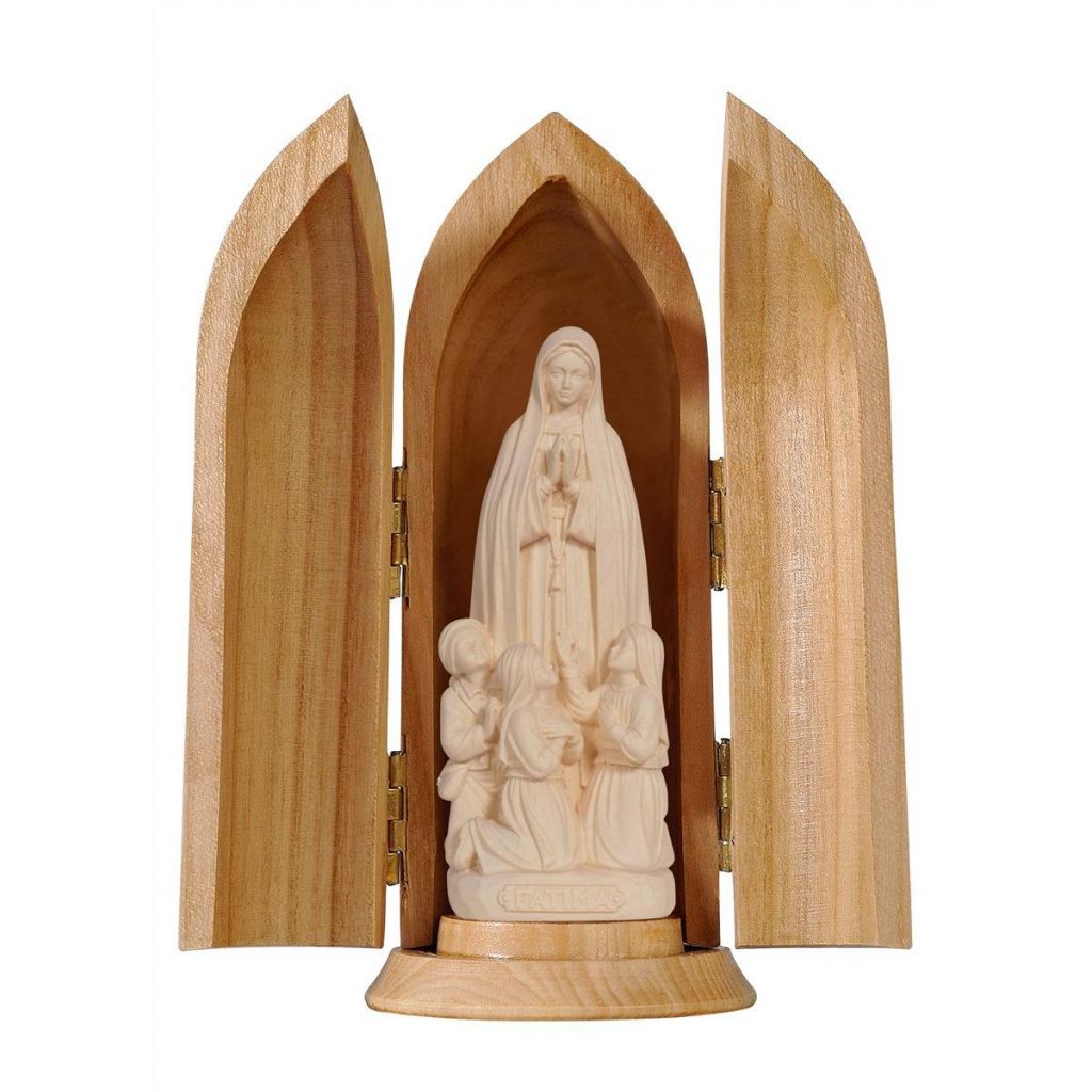 Drevená socha Panny Márie Fatimskej je nádherne maľovaná jemnými olejovými farbami a zlátená plátkovým zlatom. Dostupná vo farbe, alebo prevedení natur (prírodné drevo) v rôznych veľkostiach.