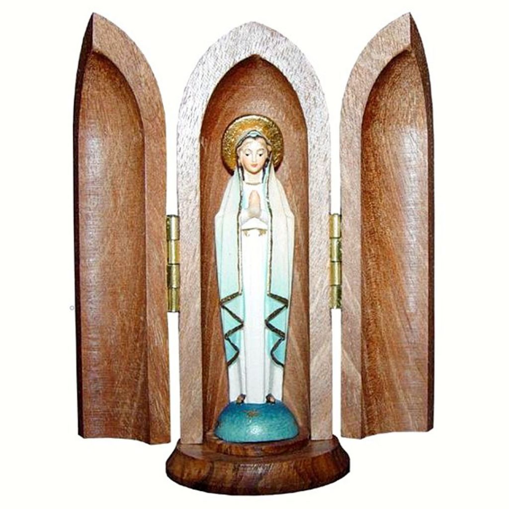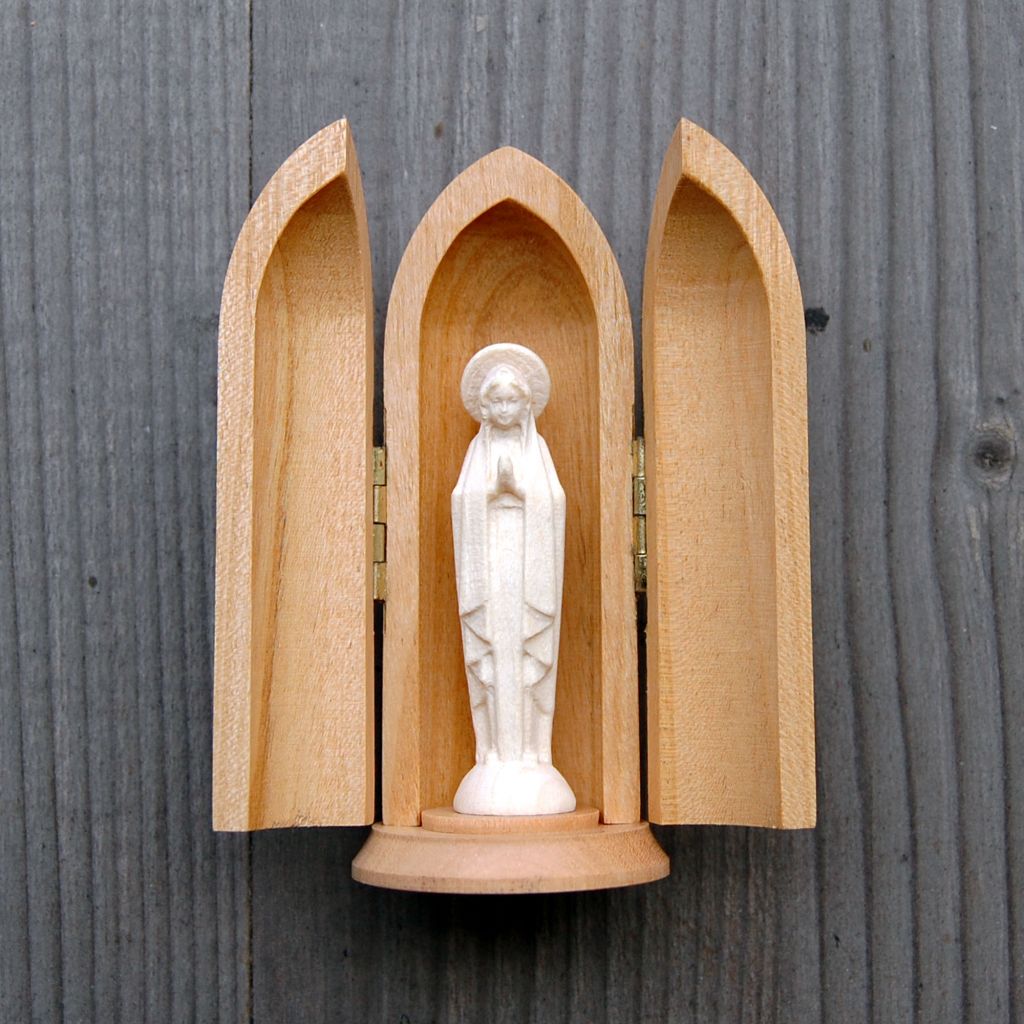 Panna Mária Fatimská v kaplnke je nádherne vyrezané z masívneho dreva, zlátené plátkovým zlatom a ručne maľované jemnými olejovými farbami. Dostupné vo farbe, alebo prevedení natur (prírodné drevo) v rôznych veľkostiach.