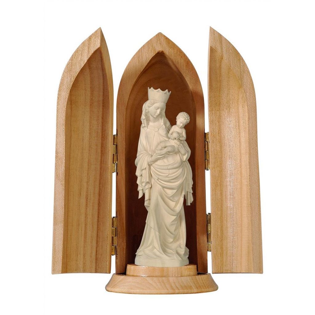Drevená socha Panny Márie je nádherne maľovaná jemnými olejovými farbami a zlátená plátkovým zlatom. Dostupná vo farbe, alebo prevedení natur (prírodné drevo) v rôznych veľkostiach.