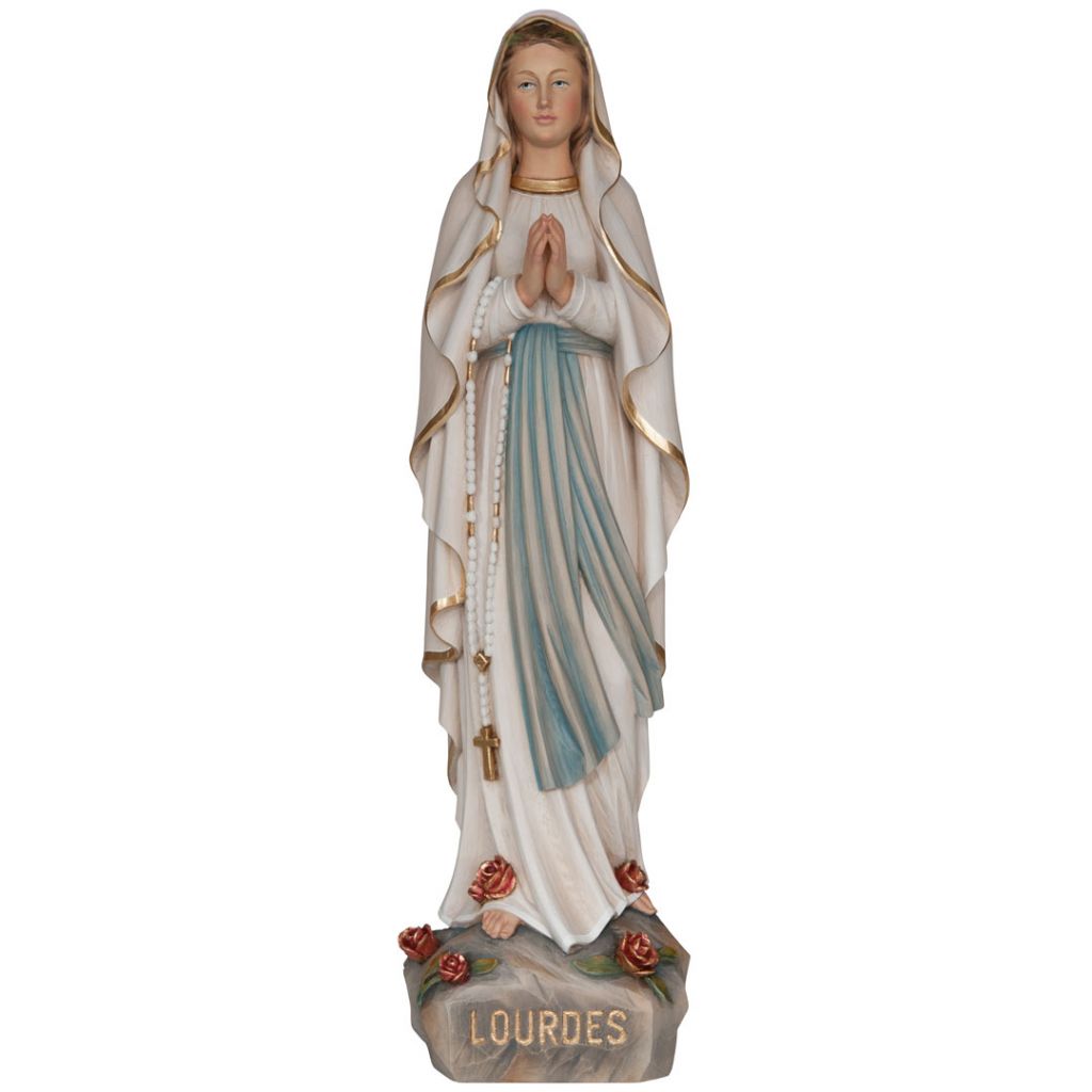 Drevená socha Panny Márie Lurdskej je nádherne vyrezaná z javorového dreva, ručne maľovaná jemnými olejovými farbami a zlátená plátkovým zlatom.
