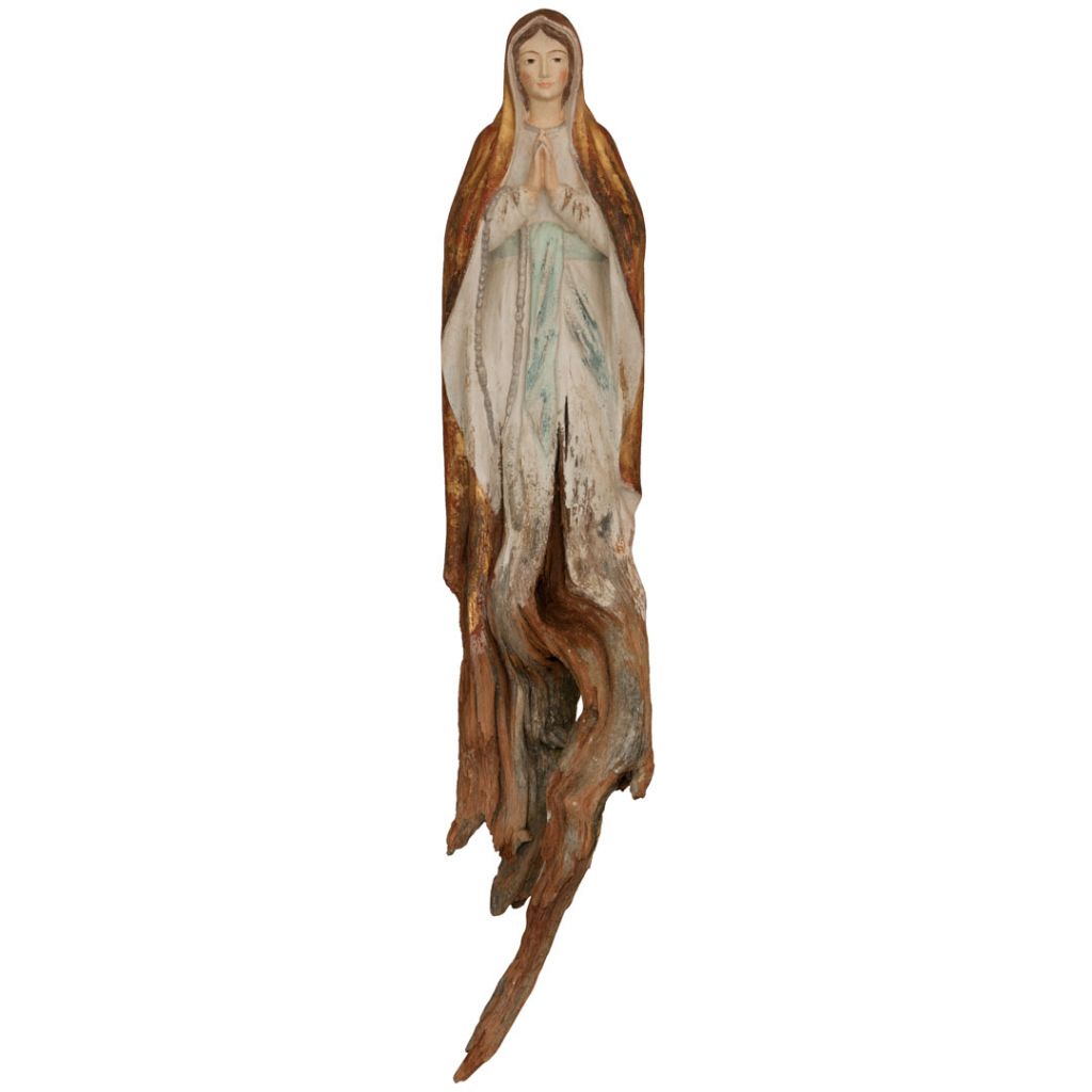 Drevená socha Panny Márie Lurdskej je nádherne vyrezaná z koreňového dreva, ručne maľovaná jemnými olejovými farbami a zlátená plátkovým zlatom. Dostupná vo farbe v rôznych veľkostiach.