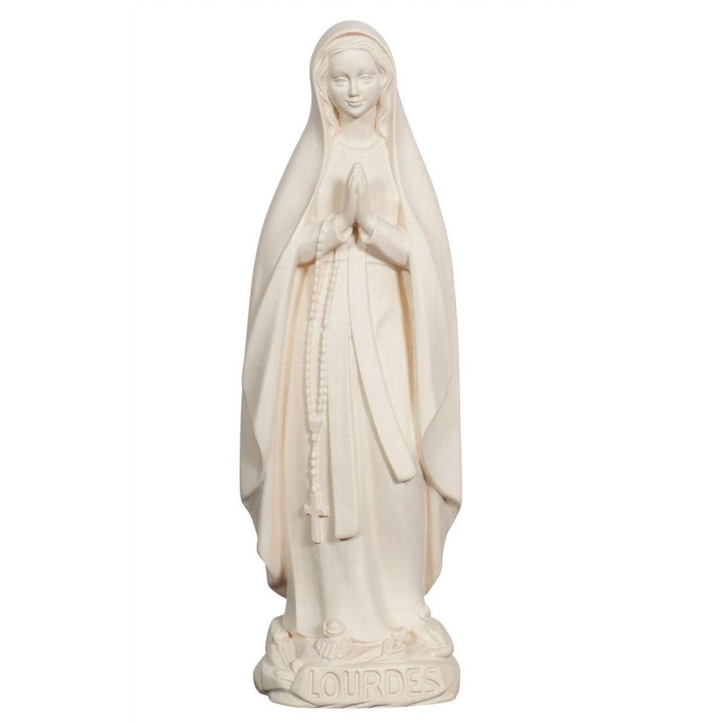 Drevená socha Panny Márie Lurdskej je nádherne maľovaná jemnými olejovými farbami a zlátená plátkovým zlatom. Dostupná vo farbe, alebo prevedení natur (prírodné drevo) v rôznych veľkostiach.