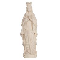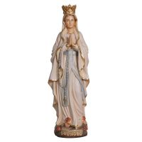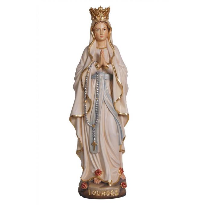 Drevená socha Panny Márie Lurdskej je nádherne maľovaná jemnými olejovými farbami a zlátená plátkovým zlatom. Dostupná vo farbe, alebo prevedení natur (prírodné drevo) v rôznych veľkostiach.