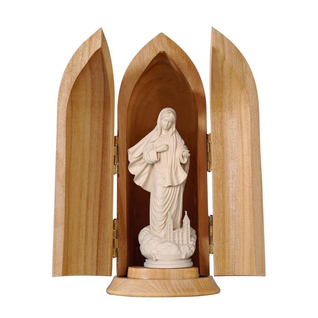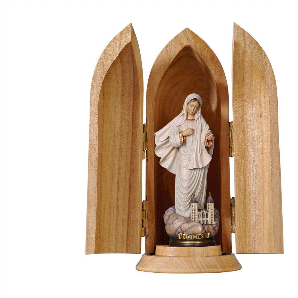 Drevená socha Panny Márie Medžugorskej je nádherne maľovaná jemnými olejovými farbami a zlátená plátkovým zlatom. Dostupná vo farbe, alebo prevedení natur (prírodné drevo) v rôznych veľkostiach.