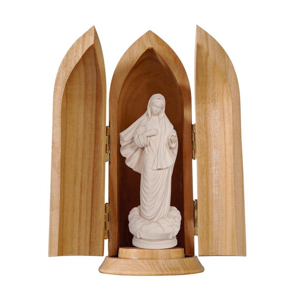 Drevená socha Panny Márie Medžugorskej je nádherne maľovaná jemnými olejovými farbami a zlátená plátkovým zlatom. Dostupná vo farbe, alebo prevedení natur (prírodné drevo) v rôznych veľkostiach.