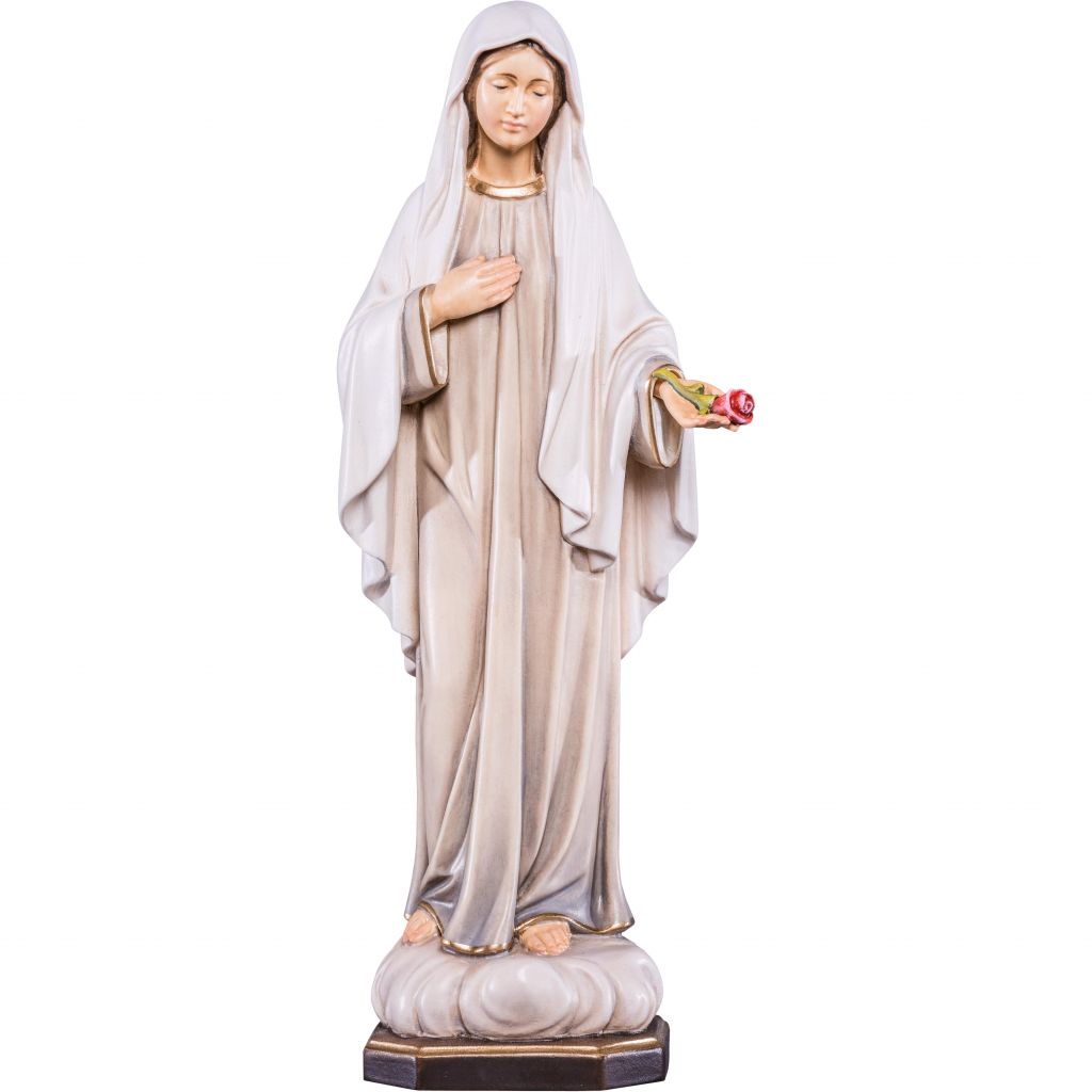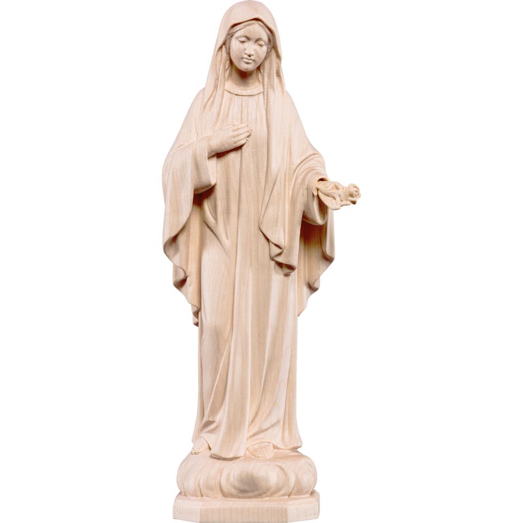 Drevená socha Panny Márie mieru je nádherne vyrezaná z javorového dreva, ručne maľovaná jemnými olejovými farbami a zlátená plátkovým zlatom. Dostupná vo farbe, alebo prevedení natur (prírodné drevo) v rôznych veľkostiach.