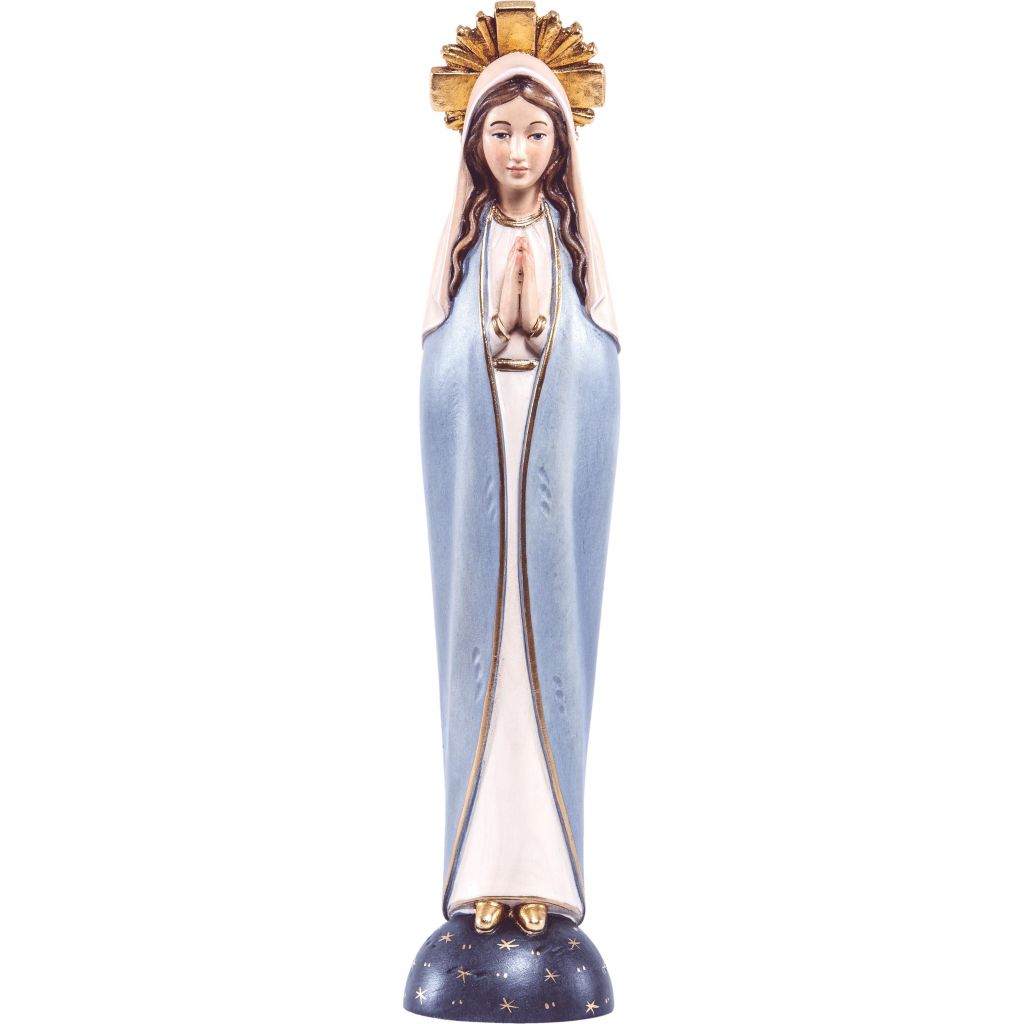 Drevená socha Panny Márie je nádherne vyrezaná z javorového dreva, ručne maľovaná jemnými olejovými farbami a zlátená plátkovým zlatom. Dostupná vo farbe, alebo prevedení natur (prírodné drevo) v rôznych veľkostiach.