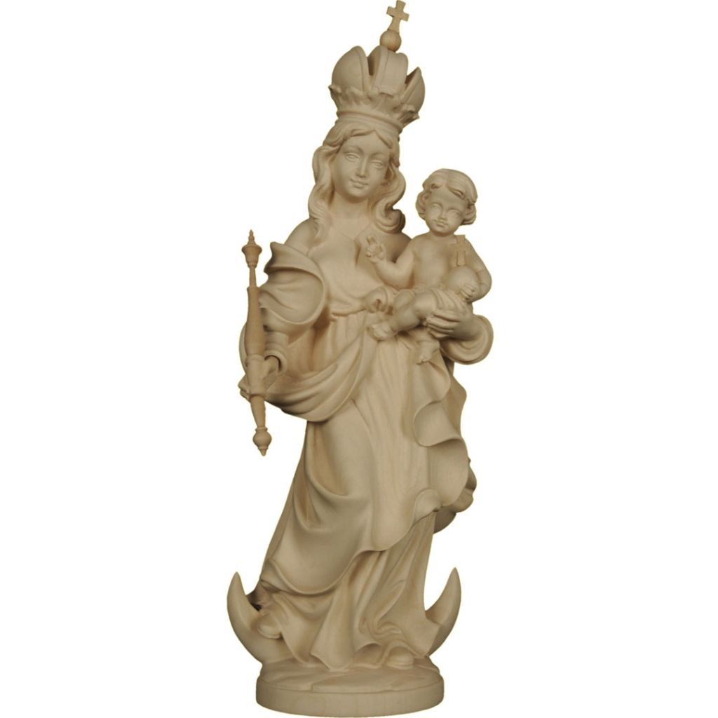 Drevená socha Panny Márie patrónky Bavorska je nádherne vyrezaná z javorového dreva, ručne maľovaná jemnými olejovými farbami a zlátená plátkovým zlatom.