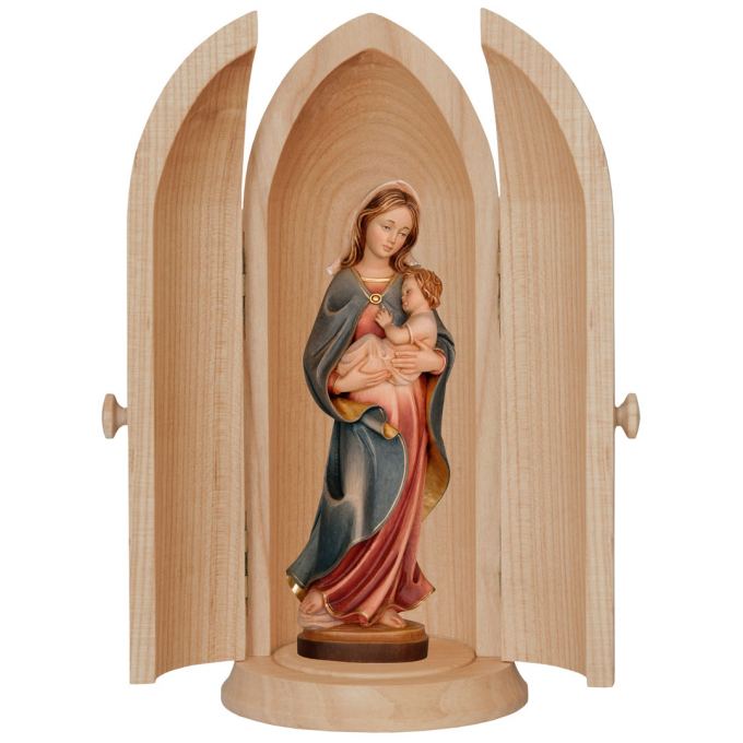 Drevená socha Panny Márie patrónky Svätých v kaplnke je nádherne vyrezaná z javorového dreva, ručne maľovaná jemnými olejovými farbami a zlátená plátkovým zlatom.