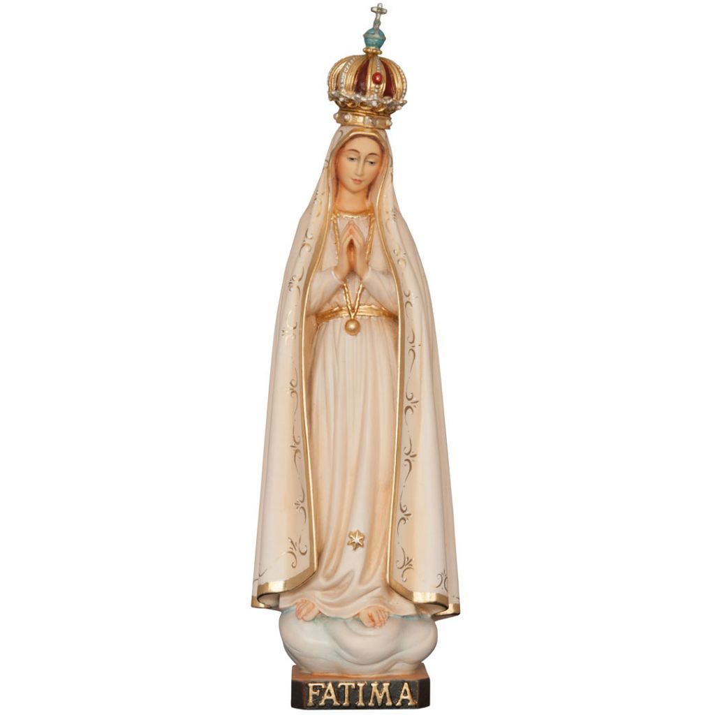 Drevená socha Panny Márie Pútnickej s korunkou je nádherne vyrezaná z javorového dreva, ručne maľovaná jemnými olejovými farbami a zlátená plátkovým zlatom.