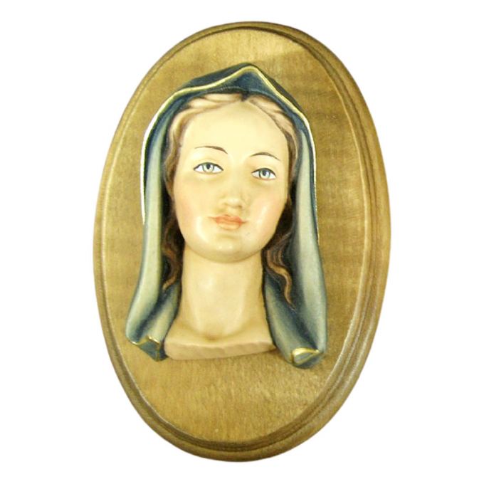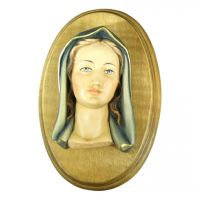 Drevený reliéf Panny Márie je nádherne vyrezaný z masívneho dreva a ručne maľovaný jemnými olejovými farbami.