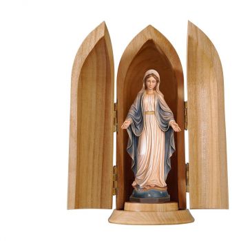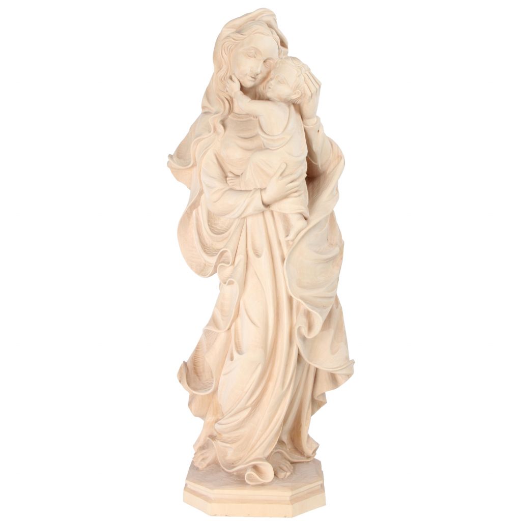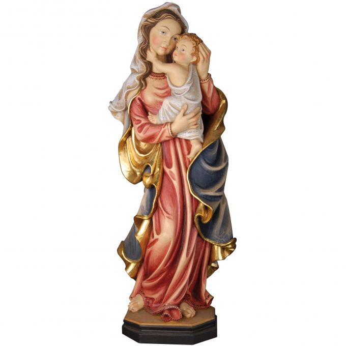 Drevená socha Panny s dieťaťom je nádherne vyrezaná z javorového dreva, ručne maľovaná jemnými olejovými farbami a zlátená plátkovým zlatom. Dostupná vo farbe, alebo prevedení natur (prírodné drevo) v rôznych veľkostiach.