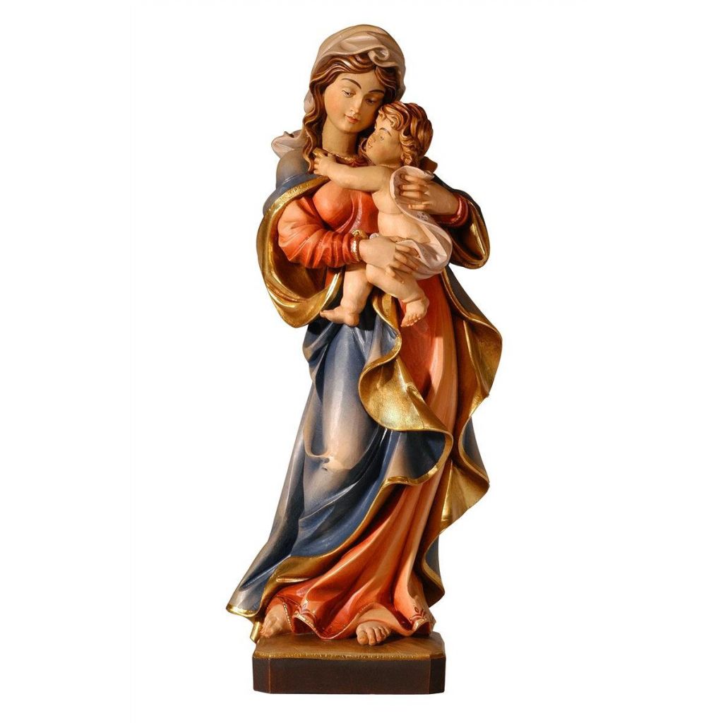 Drevená socha Panny Márie je nádherne maľovaná jemnými olejovými farbami a zlátená plátkovým zlatom. Dostupná vo farbe, alebo prevedení natur (prírodné drevo) v rôznych veľkostiach.