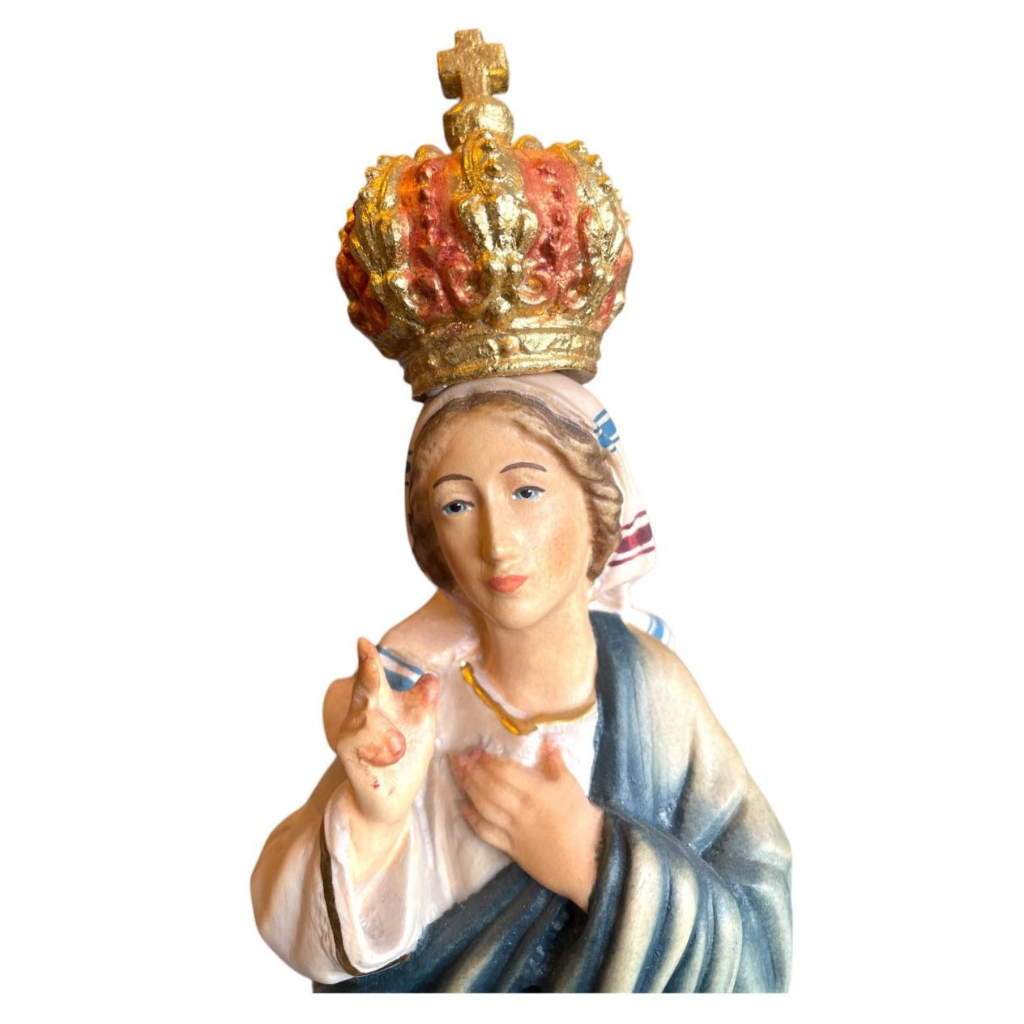 Jej ľavá ruka jemne odpočíva na jej hrudi, zatiaľ čo pravá ruka tvorí gesto požehnania, čím vyjadruje pocit mieru a ochrany. Nádherná koruna, zdobená zlatom a kráľovskými červenými akcentmi, je ukončená zlatým krížom, symbolizujúcim vieru a oddanosť. Celé dielo je umiestnené na nádherne vyrezávanej základni, ktorá dodáva stabilitu a štýl kúsku.