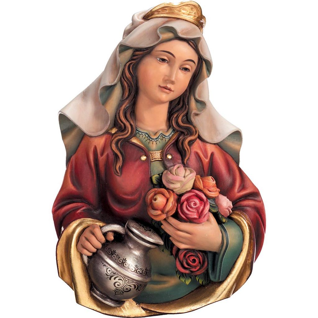 Drevený reliéf Svätej Alžbety je nádherne vyrezaný z javorového dreva a ručne maľovaný jemnými olejovými farbami. Dostupný vo farbe, alebo prevedení natur (prírodné nemaľované drevo) v rôznych veľkostiach.