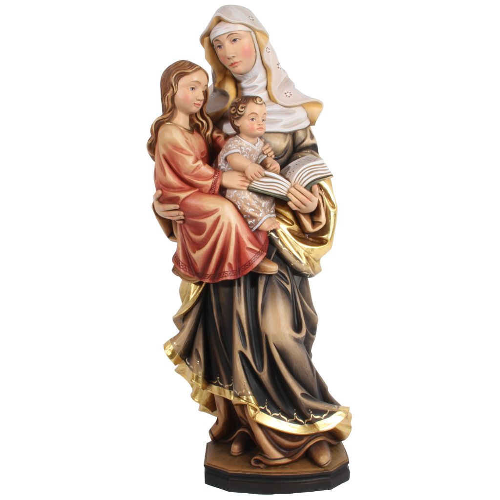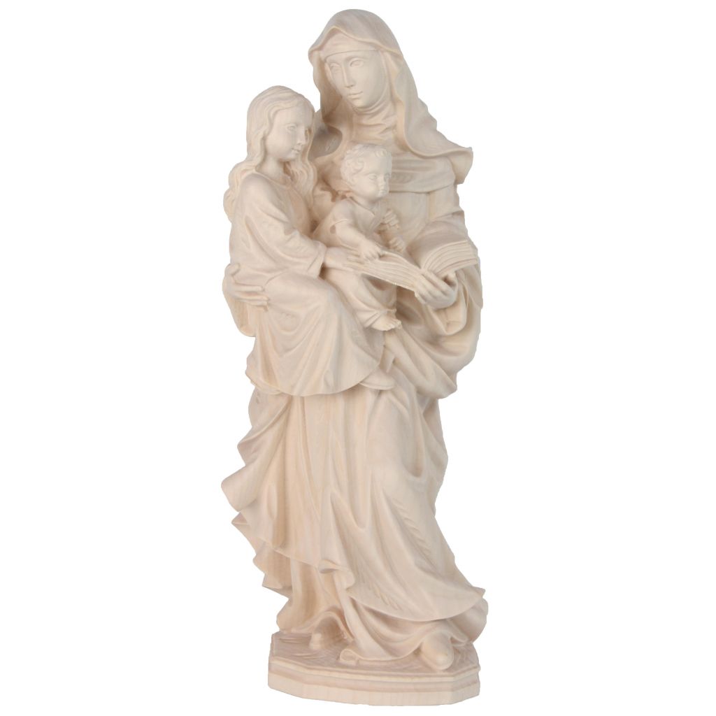 Svätá Anna s Máriou a Ježišom je nádherne vyrezaná z javorového dreva, ručne maľovaná jemnými olejovými farbami a zlátená plátkovým zlatom. Dostupná vo farbe, alebo prevedení natur (prírodné drevo) v rôznych veľkostiach.