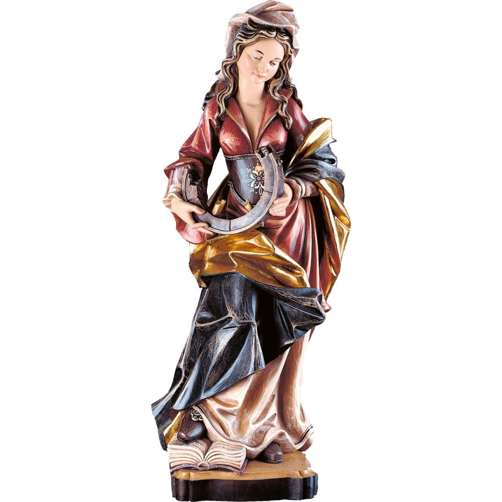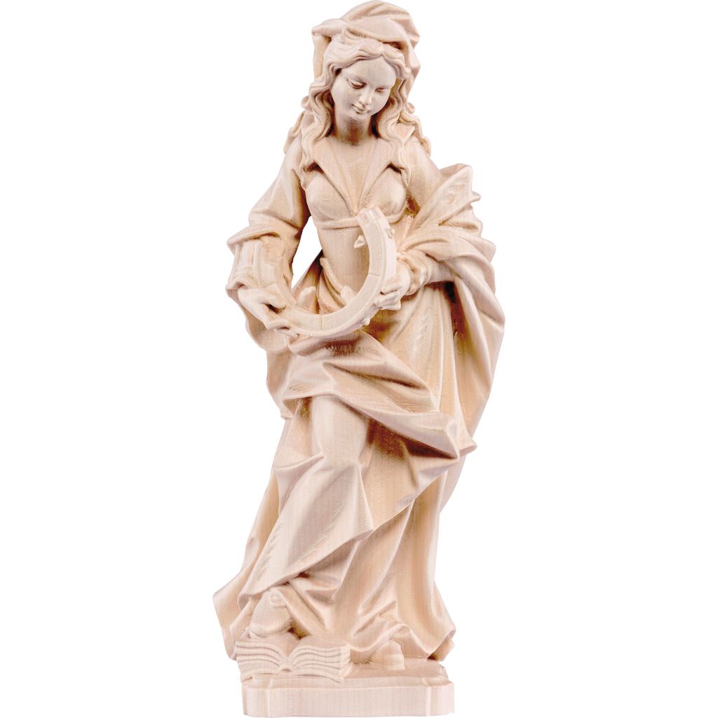 Drevená socha Svätej Kataríny je vyrezaná z masívneho dreva, nádherne maľovaná jemnými olejovými farbami a zlátená plátkovým zlatom. Dostupná vo farbe, alebo prevedení natur (prírodné drevo) v rôznych veľkostiach.