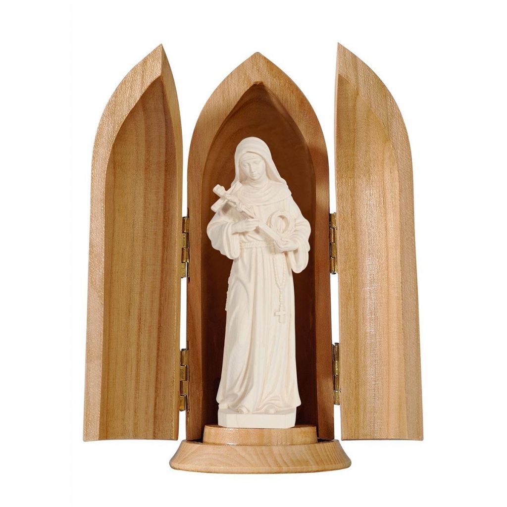 Drevená socha Svätej Rity v kaplnke je nádherne vyrezaná z javorového dreva, ručne maľovaná jemnými olejovými farbami a zlátená plátkovým zlatom.